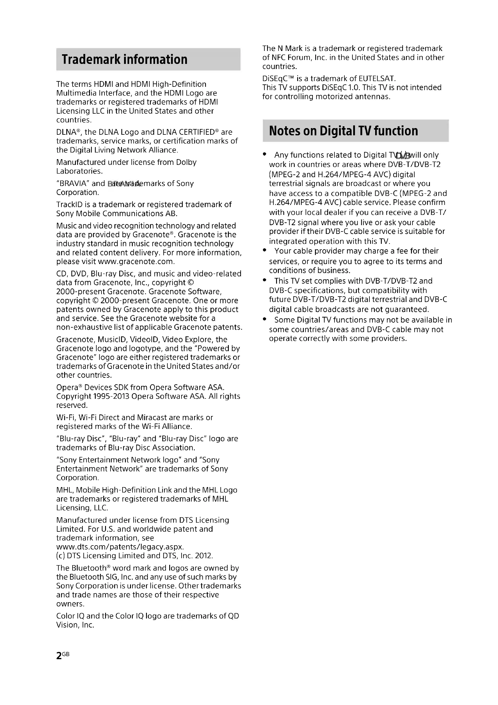 The terms HDMI and HDMI High-Definition Multimedia Interface, and the HDMI Logo are trademarks or registered trademarks of HDMI Licensing LLC in the United States and other countries. DLNA®, the DLNA Logo and DLNA CERTIFIED® are trademarks, service marks, or certification marks of the Digital Living Network Alliance. Manufactured under license from Dolby Laboratories. “BRAVIA” and are trademarks of Sony Corporation. TrackID is a trademark or registered trademark of Sony Mobile Communications AB. Music and video recognition technology and related data are provided by Gracenote®. Gracenote is the industry standard in music recognition technology and related content delivery. For more information, please visit www.gracenote.com. CD, DVD, Blu-ray Disc, and music and video-related data from Gracenote, Inc., copyright © 2000-present Gracenote. Gracenote Software, copyright © 2000-present Gracenote. One or more patents owned by Gracenote apply to this product and service. See the Gracenote website for a non-exhaustive list of applicable Gracenote patents. Gracenote, MusicID, VideoID, Video Explore, the Gracenote logo and logotype, and the “Powered by Gracenote” logo are either registered trademarks or trademarks of Gracenote in the United States and/or other countries. Opera® Devices SDK from Opera Software ASA. Copyright 1995-2013 Opera Software ASA. All rights reserved. Wi-Fi, Wi-Fi Direct and Miracast are marks or registered marks of the Wi-Fi Alliance. “Blu-ray Disc”, “Blu-ray” and “Blu-ray Disc” logo are trademarks of Blu-ray Disc Association. “Sony Entertainment Network logo” and “Sony Entertainment Network” are trademarks of Sony Corporation. MHL, Mobile High-Definition Link and the MHL Logo are trademarks or registered trademarks of MHL Licensing, LLC. Manufactured under license from DTS Licensing Limited. For U.S. and worldwide patent and trademark information, see www.dts.com/patents/legacy.aspx. (c) DTS Licensing Limited and DTS, Inc. 2012. The Bluetooth® word mark and logos are owned by the Bluetooth SIG, Inc. and any use of such marks by Sony Corporation is under license. Other trademarks and trade names are those of their respective owners. Color IQ and the Color IQ logo are trademarks of QD Vision, Inc. The N Mark is a trademark or registered trademark of NFC Forum, Inc. in the United States and in other countries. DiSEqC™ is a trademark of EUTELSAT. This TV supports DiSEqC 1.0. This TV is not intended for controlling motorized antennas. Any functions related to Digital TV ( ) will only work in countries or areas where DVB-T/DVB-T2 (MPEG-2 and H.264/MPEG-4 AVC) digital terrestrial signals are broadcast or where you have access to a compatible DVB-C (MPEG-2 and H.264/MPEG-4 AVC) cable service. Please confirm with your local dealer if you can receive a DVB-T/ DVB-T2 signal where you live or ask your cable provider if their DVB-C cable service is suitable for integrated operation with this TV. Your cable provider may charge a fee for their services, or require you to agree to its terms and conditions of business. This TV set complies with DVB-T/DVB-T2 and DVB-C specifications, but compatibility with future DVB-T/DVB-T2 digital terrestrial and DVB-C digital cable broadcasts are not guaranteed. Some Digital TV functions may not be available in some countries/areas and DVB-C cable may not operate correctly with some providers. Trademark information Notes on Digital TV function3