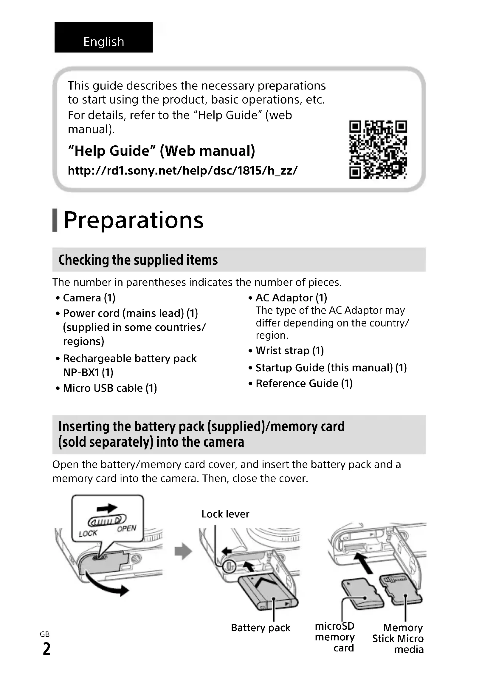 \\Win-473\camera\CX64400(ZLC)\Multi\06_Compose\4746011311_15lang\4746011311DSCHX99CE3\01GB-DSCHX99CE3\01GB.indd DTP data saved: 2018/08/20 13:53 PDF file created: 2018/08/30 10:18 English Preparations Checking the supplied items The number in parentheses indicates the number of pieces.• Camera (1)• Power cord (mains lead) (1) (supplied in some countries/regions)• Rechargeable battery pack NP-BX1 (1)• Micro USB cable (1)• AC Adaptor (1)The type of the AC Adaptor may differ depending on the country/region.• Wrist strap (1)• Startup Guide (this manual) (1)• Reference Guide (1) Inserting the battery pack (supplied)/memory card (sold separately) into the camera Open the battery/memory card cover, and insert the battery pack and a memory card into the camera. Then, close the cover.microSD memory card Memory Stick Micro mediaBattery packLock lever This guide describes the necessary preparations to start using the product, basic operations, etc. For details, refer to the “Help Guide” (web manual). “Help Guide” (Web manual) http://rd1.sony.net/help/dsc/1815/h_zz/DSC-HX99/DSC-HX95/DSC-WX800/DSC-WX7004-746-011-31(1)