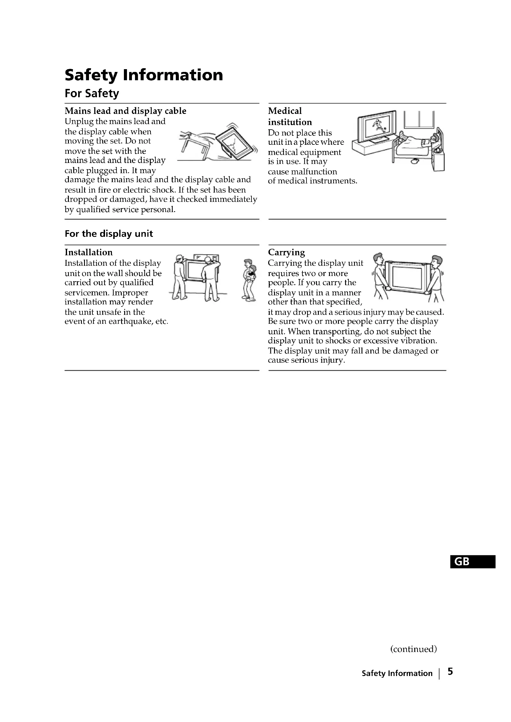Safety Information For Safety Mains lead and display cable Unplug the mains lead and the display cable when moving the set. Do not move the set with the mains lead and the display cable plugged in. It may damage the mains lead and the display cable and result in fire or electric shock. If the set has been dropped or damaged, have it checked immediately by qualified service personal. Medical institution Do not place this unit in a place where medical equipment is in use. It may cause malfunction of medical instruments. For the display unit Installation Installation of the display unit on the wall should be carried out by qualified servicemen. Improper installation may render the unit unsafe in the event of an earthquake, etc. Carrying Carrying the display unit requires two or more people. If you carry the display unit in a manner other than that specified, it may drop and a serious injury may be caused. Be sure two or more people carry the display unit. When transporting, do not subject the display unit to shocks or excessive vibration. The display unit may fall and be damaged or cause serious injury. (continued)6 Safety Information Installation and moving Ventilation Never cover the ventilation holes in the cabinet. It may cause overheating and result in fire. Unless proper ventilation is provided, the unit may gather dust and get dirty. For proper ventilation, observe the following: