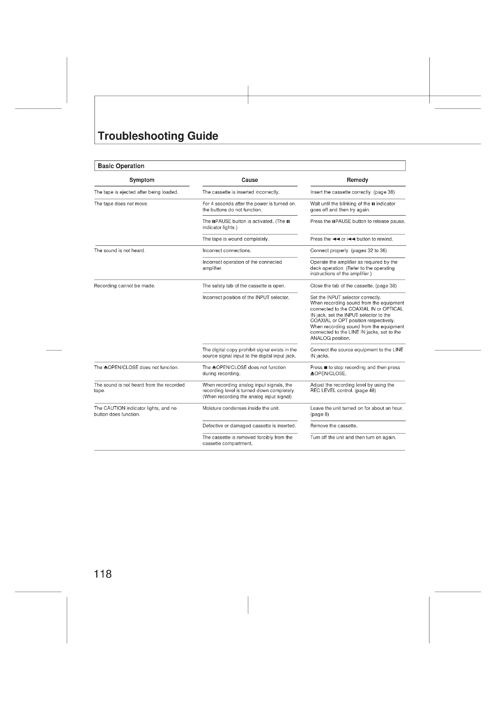 Cabo óptico digital Entrada/saída digital118 Symptom The tape is ejected after being loaded. The tape does not move. The sound is not heard. Recording cannot be made. The 0OPEN/CLOSE does not function. The sound is not heard from the recorded tape. The CAUTION indicator lights, and no button does function. Troubleshooting Guide Cause The cassette is inserted incorrectly. For 4 seconds after the power is turned on, the buttons do not function. The 8PAUSE button is activated. (The 8 indicator lights.) The tape is wound completely. Incorrect connections. Incorrect operation of the connected amplifier. The safety tab of the cassette is open. Incorrect position of the INPUT selector. The digital copy prohibit signal exists in the source signal input to the digital input jack. The 0OPEN/CLOSE does not function during recording. When recording analog input signals, the recording level is turned down completely. (When recording the analog input signal) Moisture condenses inside the unit. Defective or damaged cassette is inserted. The cassette is removed forcibly from the cassette compartment. Remedy Insert the cassette correctly. (page 38) Wait until the blinking of the 8 indicator goes off and then try again. Press the 8PAUSE button to release pause. Press the 1 or 4 button to rewind. Connect properly. (pages 32 to 36) Operate the amplifier as required by the deck operation. (Refer to the operating instructions of the amplifier.) Close the tab of the cassette. (page 38) Set the INPUT selector correctly. When recording sound from the equipment connected to the COAXIAL IN or OPTICAL IN jack, set the INPUT selector to the COAXIAL or OPT position respectively. When recording sound from the equipment connected to the LINE IN jacks, set to the ANALOG position. Connect the source equipment to the LINE IN jacks. Press 7 to stop recording and then press 0OPEN/CLOSE. Adjust the recording level by using the REC LEVEL control. (page 48) Leave the unit turned on for about an hour. (page 8) Remove the cassette. Turn off the unit and then turn on again. Basic Operation119 Cause Insert a cassette tape with its safety tab at the record-impossible position. A new start ID cannot be written within 9 seconds (18 seconds in the long-play mode) from the end of another start ID. The start ID is not written correctly. The portion between the end of a start ID and the beginning of the following start ID is less than 9 seconds (18 seconds in the long-play mode) long. The selected program number does not exist on the tape. The program numbers are out of order. The skip play function is operating. (The SKIP indicator lights in the display window.) The repeat play function is operating. There is a blank section between selections. (The sampling frequency indicator blinks on the display.) While writing the start ID (9 seconds or 18 seconds), none of the buttons except the 7 button are operative. Recording was started from the blank section. The portion where you want to write the end ID is blank. The portion between the end of a start ID and the beginning of the following start ID is less than 9 seconds (18 seconds in the long-play mode) long. Two skip IDs are written continuously. The end ID is written at the beginning of the tape. The end ID is written immediately after a start ID. Sub Code Operation Symptom Sub codes cannot be written. Start ID cannot be written during recording. Search function does not operate during playback. Search function operates suddenly during playback. Search function stops. The tape operation buttons do not operate while writing the start ID. The absolute time codes cannot be written. End ID cannot be written during playback. Renumbering function does not operate. Start ID cannot be erased. Skip ID cannot be erased. End ID cannot be erased. Remedy Insert a cassette tape with its safety tab at the record-possible position. (Page 38) Leave at least 9 seconds (18 seconds in the long-play mode) from the end of another start ID. Erase it (page 68), and then write it again. When writing the start IDs manually, write so that the intervals between them are more than 9 seconds (18 seconds in the long-play mode.) Use the RENUMBER button to re-arrange the program numbers. (page 74) Turn off the indicator by pressing SKIP PLAY. Turn off the indicator by pressing REPEAT 1/ALL. Use the end search function (page 54) when recording so that no blank is created. Operate after the start ID is written. Rewind the tape to the beginning, or locate the very last point of the previous recording by using the end search function (page 54), and start recording from the point. Set the deck in the record-pause mode by pressing ¶REC, then write the end ID. When writing the start IDs manually, write so that the intervals between them are more than 9 seconds (18 seconds in the long-play mode). When writing the skip IDs, write so that the intervals between them are more than 1 second (2 seconds in the long-play mode). Start recording from the beginning of the tape. First erase the start ID.120 Troubleshooting Guide Others Symptom Tape transport noise seems excessively loud in rewind or fastforward mode. The tape stops running suddenly. Unbalanced left and right volume. Increase of noise or deterioration of sound quality. After pressing 1/¡ or 4/¢, the tape stops for a moment, and then starts running. Cause This situation depends upon the cassette being used and is not a problem. A defective or damaged cassette has been inserted. Incorrect adjustment of the recording balance. Contamination of the head. This is not a problem. Remedy