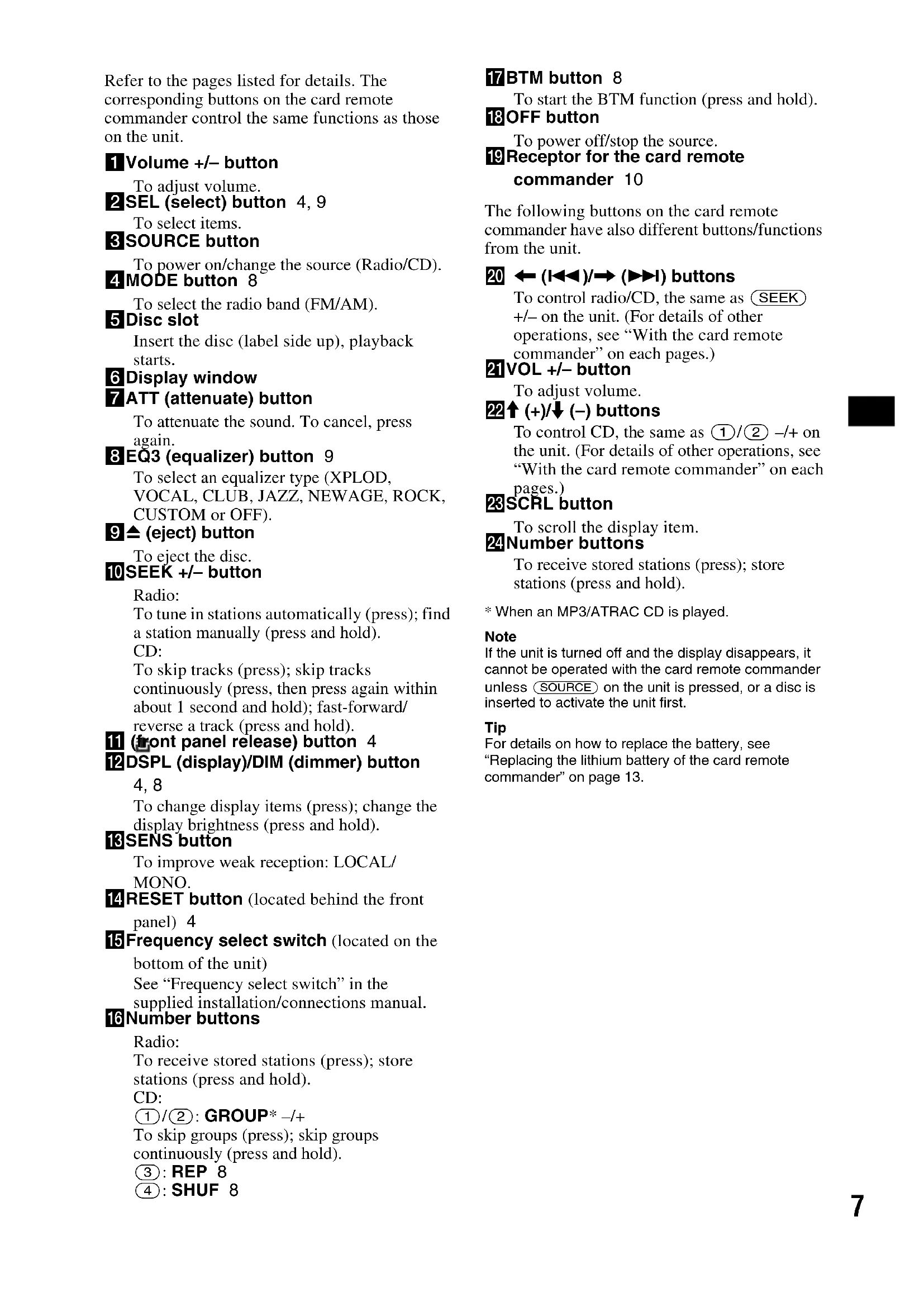 ws7 Refer to the pages listed for details. The corresponding buttons on the card remote commander control the same functions as those on the unit. a Volume +/– button To adjust volume. b SEL (select) button 4, 9 To select items. c SOURCE button To power on/change the source (Radio/CD). d MODE button 8 To select the radio band (FM/AM). e Disc slot Insert the disc (label side up), playback starts. f Display window g ATT (attenuate) button To attenuate the sound. To cancel, press again. h EQ3 (equalizer) button 9 To select an equalizer type (XPLOD, VOCAL, CLUB, JAZZ, NEWAGE, ROCK, CUSTOM or OFF). i Z (eject) button To eject the disc. j SEEK +/– button Radio: To tune in stations automatically (press); find a station manually (press and hold). CD: To skip tracks (press); skip tracks continuously (press, then press again within about 1 second and hold); fast-forward/ reverse a track (press and hold). k (front panel release) button 4 l DSPL (display)/DIM (dimmer) button 4, 8 To change display items (press); change the display brightness (press and hold). m SENS button To improve weak reception: LOCAL/ MONO. n RESET button (located behind the front panel) 4 o Frequency select switch (located on the bottom of the unit) See “Frequency select switch” in the supplied installation/connections manual. p Number buttons Radio: To receive stored stations (press); store stations (press and hold). CD: (1)/(2): GROUP* –/+ To skip groups (press); skip groups continuously (press and hold). (3): REP 8 (4): SHUF 8 q BTM button 8 To start the BTM function (press and hold). r OFF button To power off/stop the source. s Receptor for the card remote commander 10 The following buttons on the card remote commander have also different buttons/functions from the unit. t < (. )/, (>) buttons To control radio/CD, the same as (SEEK) +/– on the unit. (For details of other operations, see “With the card remote commander” on each pages.) u VOL +/– button To adjust volume. v M (+)/m (–) buttons To control CD, the same as (1)/(2) –/+ on the unit. (For details of other operations, see “With the card remote commander” on each pages.) w SCRL button To scroll the display item. x Number buttons To receive stored stations (press); store stations (press and hold).