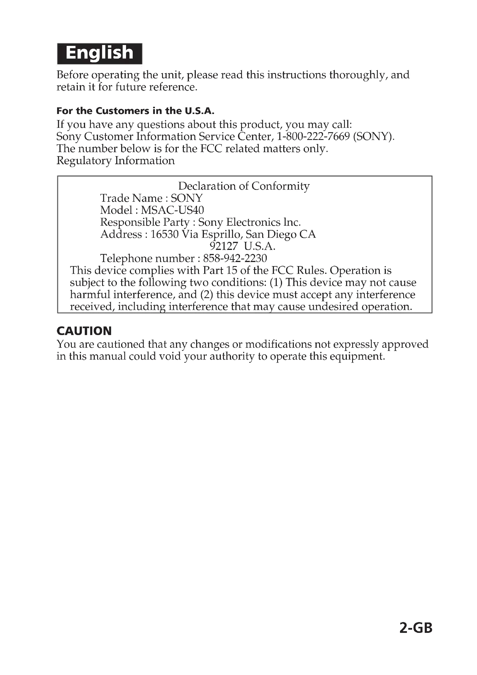 108-0075 1-7-1Memory Stick USB Reader/Writer MSAC-US40 Operating Instructions2-GB English Before operating the unit, please read this instructions thoroughly, and retain it for future reference. For the Customers in the U.S.A. If you have any questions about this product, you may call: Sony Customer Information Service Center, 1-800-222-7669 (SONY). The number below is for the FCC related matters only. Regulatory Information Declaration of Conformity Trade Name : SONY Model : MSAC-US40 Responsible Party : Sony Electronics lnc. Address : 16530 Via Esprillo, San Diego CA 92127 U.S.A. Telephone number : 858-942-2230 This device complies with Part 15 of the FCC Rules. Operation is subject to the following two conditions: (1) This device may not cause harmful interference, and (2) this device must accept any interference received, including interference that may cause undesired operation. CAUTION You are cautioned that any changes or modifications not expressly approved in this manual could void your authority to operate this equipment.3-GB Note: This equipment has been tested and found to comply with the limits for a Class B digital device, pursuant to Part 15 of the FCC Rules. These limits are designed to provide reasonable protection against harmful interference in a residential installation. This equipment generates, uses, and can radiate radio frequency energy and, if not installed and used in accordance with the instructions, may cause harmful interference to radio communications. However, there is no guarantee that interference will not occur in a particular installation. If this equipment does cause harmful interference to radio or television reception, which can be determined by turning the equipment off and on, the user is encouraged to try to correct the interference by one or more of the following measures: – Reorient or relocate the receiving antenna. – Increase the separation between the equipment and receiver. – Connect the equipment into an outlet on a circuit different from that to which the receiver is connected. – Consult the dealer or an experienced radio/TV technician for help. The specified USB cable (supplied) must be used with the equipment in order to comply with the limits for a digital device pursuant to Subpart B of Part 15 of FCC Rules. For the customers in Canada This class B digital apparatus complies with Canadian ICES-003. Notice If static electricity or electromagnetism causes data transfer to discontinue midway (fail), restart the application or disconnect and connect the USB cable again.4-GB Program©2005 Sony Corporation Documentation©2005 Sony Corporation