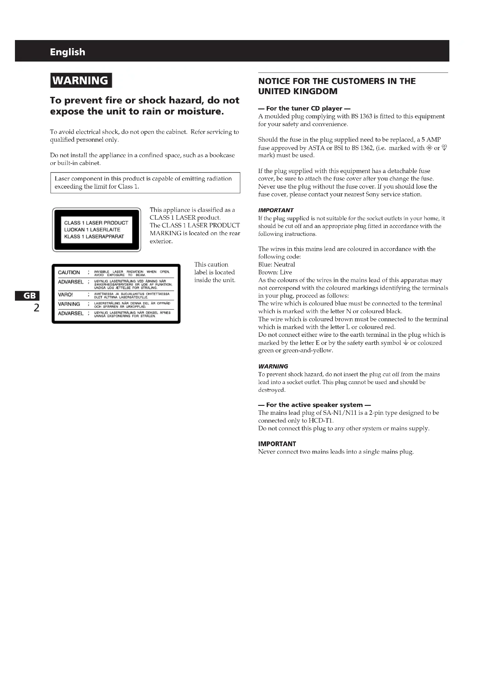 UNITED KINGDOM — For the tuner CD player — A moulded plug complying with BS 1363 is fitted to this equipment for your safety and convenience. Should the fuse in the plug supplied need to be replaced, a 5 AMP fuse approved by ASTA or BSI to BS 1362, (i.e. marked with 2 or @ mark) must be used. If the plug supplied with this equipment has a detachable fuse cover, be sure to attach the fuse cover after you change the fuse. Never use the plug without the fuse cover. If you should lose the fuse cover, please contact your nearest Sony service station. IMPORTANT If the plug supplied is not suitable for the socket outlets in your home, it should be cut off and an appropriate plug fitted in accordance with the following instructions. The wires in this mains lead are coloured in accordance with the following code: Blue: Neutral Brown: Live As the colours of the wires in the mains lead of this apparatus may not correspond with the coloured markings identifying the terminals in your plug, proceed as follows: The wire which is coloured blue must be connected to the terminal which is marked with the letter N or coloured black. The wire which is coloured brown must be connected to the terminal which is marked with the letter L or coloured red. Do not connect either wire to the earth terminal in the plug which is marked by the letter E or by the safety earth symbol Y or coloured green or green-and-yellow. WARNING To prevent shock hazard, do not insert the plug cut off from the mains lead into a socket outlet. This plug cannot be used and should be destroyed. — For the active speaker system — The mains lead plug of SA-N1/N11 is a 2-pin type designed to be connected only to HCD-T1. Do not connect this plug to any other system or mains supply. IMPORTANT Never connect two mains leads into a single mains plug.GB