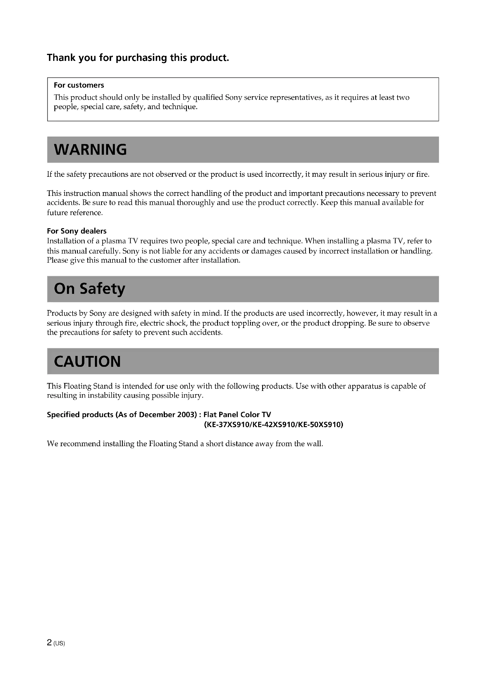 For Customers and Sony Dealers in North and Central America2 (US) Thank you for purchasing this product. For customers This product should only be installed by qualified Sony service representatives, as it requires at least two people, special care, safety, and technique. WARNING If the safety precautions are not observed or the product is used incorrectly, it may result in serious injury or fire. This instruction manual shows the correct handling of the product and important precautions necessary to prevent accidents. Be sure to read this manual thoroughly and use the product correctly. Keep this manual available for future reference. For Sony dealers Installation of a plasma TV requires two people, special care and technique. When installing a plasma TV, refer to this manual carefully. Sony is not liable for any accidents or damages caused by incorrect installation or handling. Please give this manual to the customer after installation. On Safety Products by Sony are designed with safety in mind. If the products are used incorrectly, however, it may result in a serious injury through fire, electric shock, the product toppling over, or the product dropping. Be sure to observe the precautions for safety to prevent such accidents. CAUTION This Floating Stand is intended for use only with the following products. Use with other apparatus is capable of resulting in instability causing possible injury. Specified products (As of December 2003) : Flat Panel Color TV (KE-37XS910/KE-42XS910/KE-50XS910) We recommend installing the Floating Stand a short distance away from the wall.3 (US) English