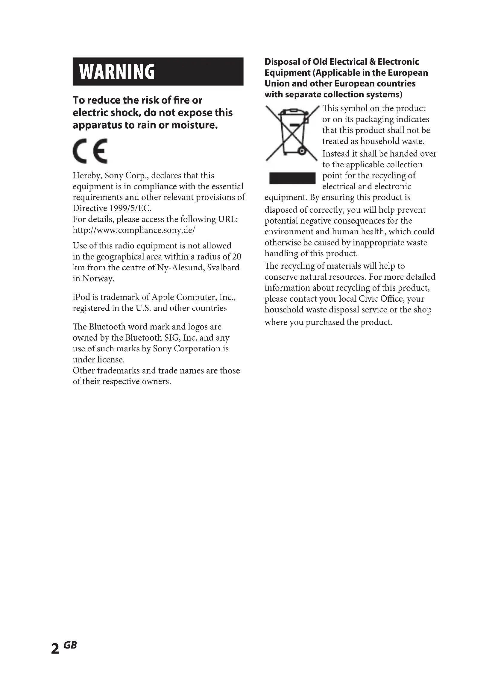 TMR-BT8iP [GB,FR,DE,ES] 3-279-360-12(1) TMR-BT8iP [GB,FR,DE,ES] 3-279-360-12(1) WARNING To reduce the risk of re or electric shock, do not expose this apparatus to rain or moisture. Hereby, Sony Corp., declares that this equipment is in compliance with the essential requirements and other relevant provisions of Directive 1999/5/EC. For details, please access the following URL: http://www.compliance.sony.de/ Use of this radio equipment is not allowed in the geographical area within a radius of 20 km from the centre of Ny-Alesund, Svalbard in Norway. iPod is trademark of Apple Computer, Inc., registered in the U.S. and other countries e Bluetooth word mark and logos are owned by the Bluetooth SIG, Inc. and any use of such marks by Sony Corporation is under license. Other trademarks and trade names are those of their respective owners. Disposal of Old Electrical & Electronic Equipment (Applicable in the European Union and other European countries with separate collection systems) is symbol on the product or on its packaging indicates that this product shall not be treated as household waste. Instead it shall be handed over to the applicable collection point for the recycling of electrical and electronic equipment. By ensuring this product is disposed of correctly, you will help prevent potential negative consequences for the environment and human health, which could otherwise be caused by inappropriate waste handling of this product. e recycling of materials will help to conserve natural resources. For more detailed information about recycling of this product, please contact your local Civic Oce, your household waste disposal service or the shop where you purchased the product.TMR-BT8iP [GB,FR,DE,ES] 3-279-360-12(1)