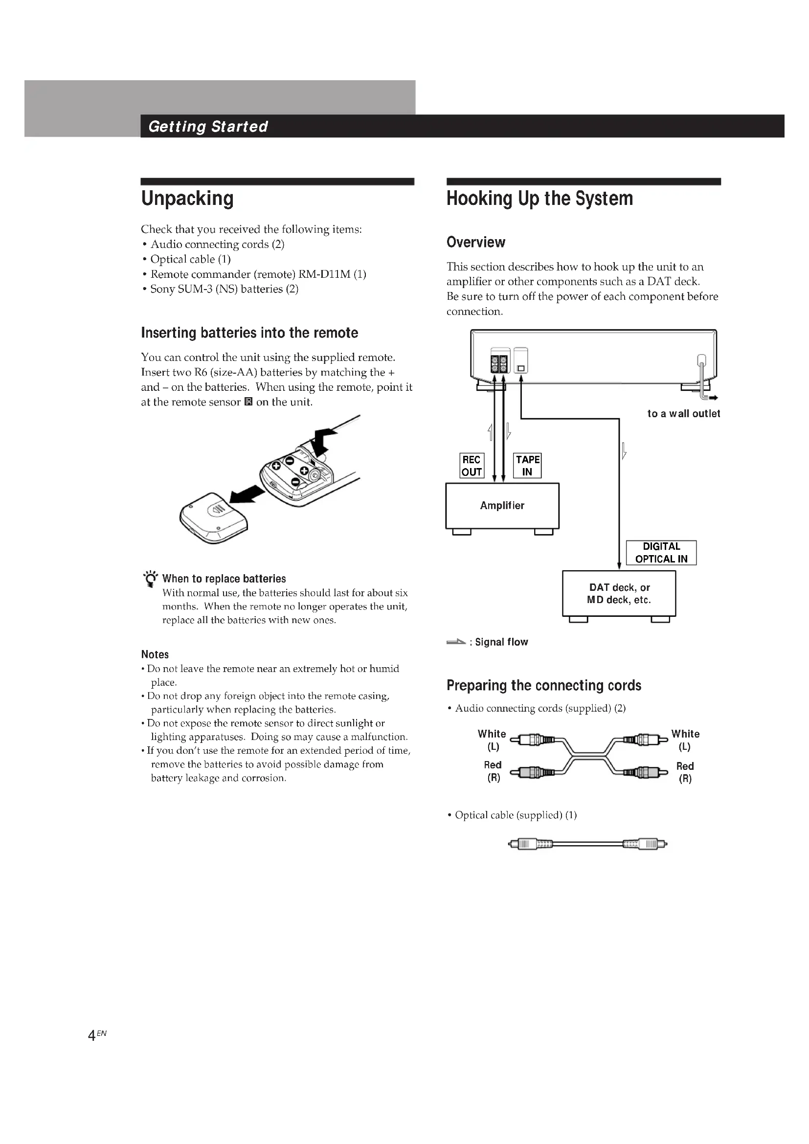 - Sony SUM-3 (NS) batteries (2) Inserting batteries into the remote You can control the unit using the supplied remote. Insert two R6 (size-AA) batteries by matching the + and – on the batteries. When using the remote, point it at the remote sensor g on the unit. Hooking Up the System Overview This section describes how to hook up the unit to an amplifier or other components such as a DAT deck. Be sure to turn off the power of each component before connection. When to replace batteries With normal use, the batteries should last for about six months. When the remote no longer operates the unit, replace all the batteries with new ones. Notes