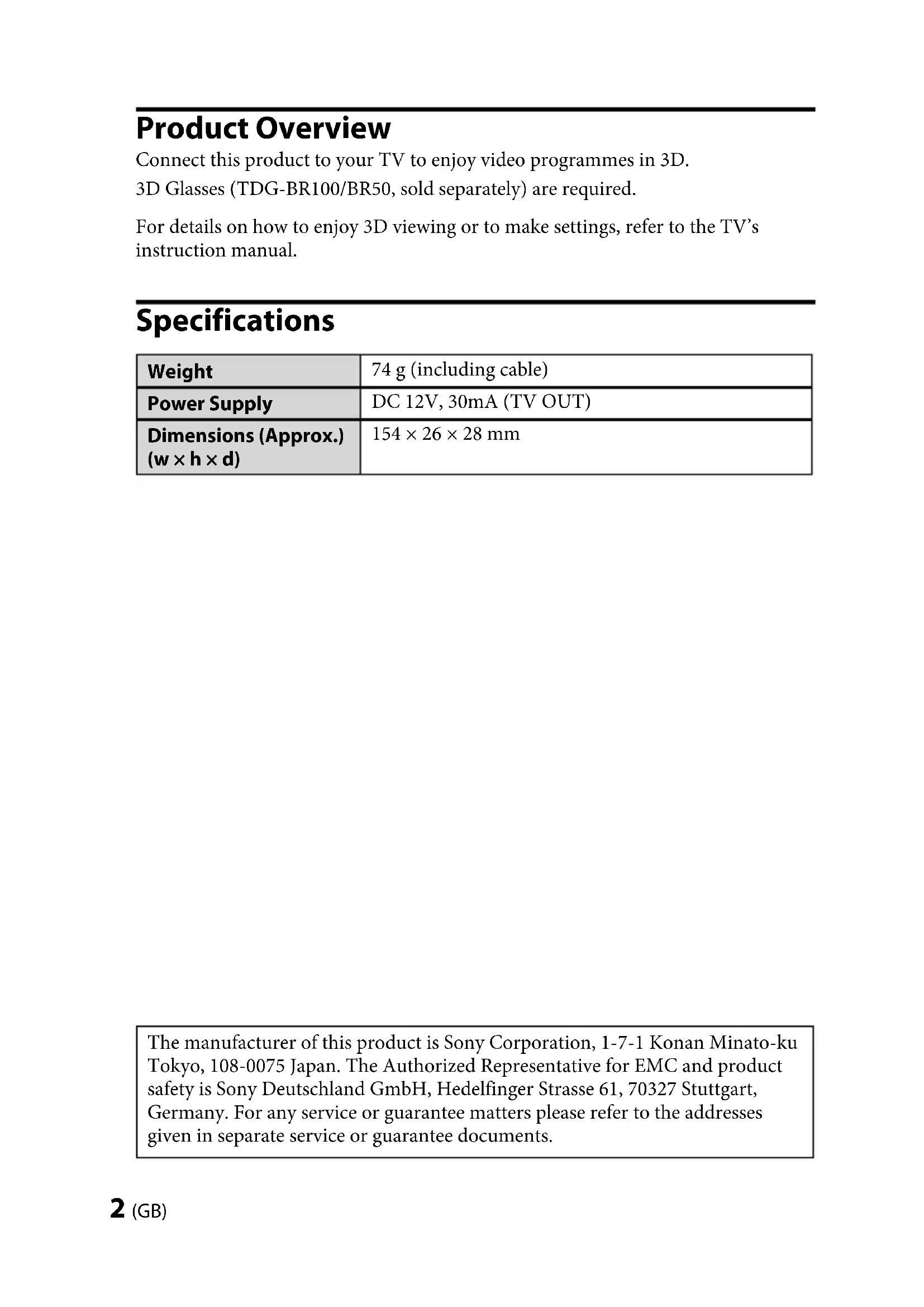 Printed in ChinaTMR-BR100 4-180-471-26(1) 2 (GB) TMR-BR100 4-180-471-26(1) Product Overview Connect this product to your TV to enjoy video programmes in 3D. 3D Glasses (TDG-BR100/BR50, sold separately) are required. For details on how to enjoy 3D viewing or to make settings, refer to the TV’s instruction manual. Specifications Weight 74 g (including cable) Power Supply DC 12V, 30mA (TV OUT) Dimensions (Approx.) (w × h × d) 154 × 26 × 28 mm The manufacturer of this product is Sony Corporation, 1-7-1 Konan Minato-ku Tokyo, 108-0075 Japan. The Authorized Representative for EMC and product safety is Sony Deutschland GmbH, Hedelfinger Strasse 61, 70327 Stuttgart, Germany. For any service or guarantee matters please refer to the addresses given in separate service or guarantee documents.TMR-BR100 4-180-471-26(1) TMR-BR100 4-180-471-26(1) 3 (GB) Disposal of the 3D Sync Transmitter Disposal of Old Electrical & Electronic Equipment (Applicable in the European Union and other European countries with separate collection systems) This symbol on the product or on its packaging indicates that this product shall not be treated as household waste. Instead it shall be handed over to the applicable collection point for the recycling of electrical and electronic equipment. By ensuring this product is disposed of correctly, you will help prevent potential negative consequences for the environment and human health, which could otherwise be caused by inappropriate waste handling of this product. The recycling of materials will help to conserve natural resources. For more detailed information about recycling of this product, please contact your local Civic Office, your household waste disposal service or the shop where you purchased the product. GBTMR-BR100 4-180-471-26(1) 4 (GB) TMR-BR100 4-180-471-26(1) Caution Please read these safety instructions to ensure your personal safety and prevent property damage. Precautions for use The 3D Glasses receive infrared rays from the 3D Sync Transmitter. If there are other infrared communication devices or lighting equipment, residential heating equipment, etc. nearby, this may affect their performance. When watching 3D video images, ensure that you are viewing the video within the specified receiving range. (refer to the illustration “3D Sync Transmitter and 3D Glasses Communication Range.”) If you use the 3D Glasses out side of the specified range, you may not be able to watch 3D video images. The 3D Sync Transmitter signal may interfere with Infrared remote control operation. In such a case, reorient the 3D Sync Transmitter. Safety Precautions You should only use this product for watching 3D video images on a compatible Sony television. Some people may experience discomfort (such as eye strain, fatigue, or nausea) when using this product. Sony recommends that all viewers take regular breaks while watching 3D video images or playing stereoscopic 3D games. The length and frequency of necessary breaks will vary from person to person. You must decide what works best. If you experience any discomfort, you should stop using this product and watching the 3D video images until the discomfort ends; consult a doctor if you believe necessary. You should also review (i) the instruction manual of your television, as well as any other device or media used with your television and (ii) our website (http://www.sony-europe.com/ myproduct) for the latest information. The vision of young children (especially those under six years old) is still under development. Consult your doctor (such as a pediatrician or eye doctor) before allowing young children to watch 3D video images or play stereoscopic 3D games. Adults should supervise young children to ensure they follow the recommendations listed above. Do not drop or modify this product.
