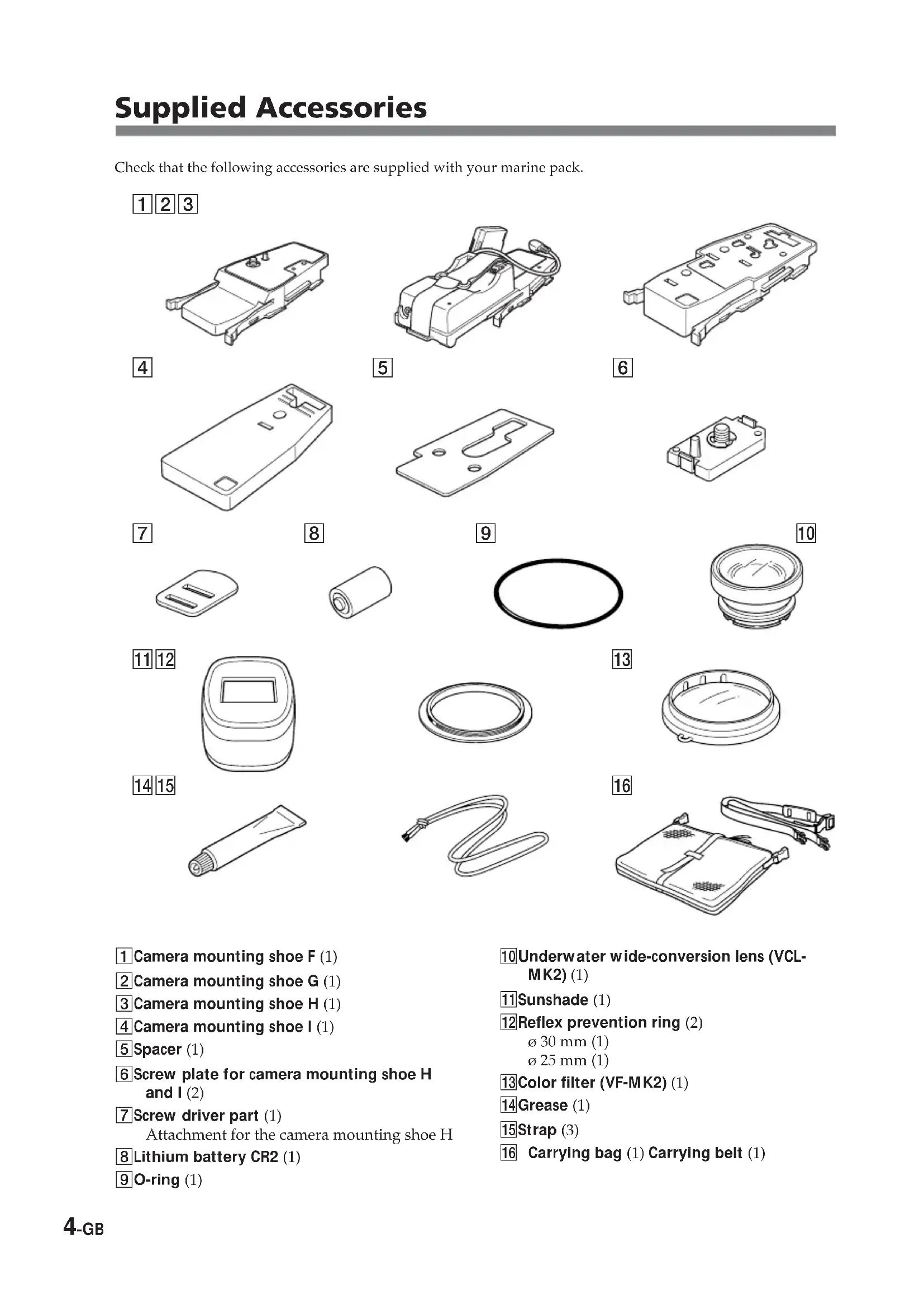 - Specifications -GB Supplied Accessories Check that the following accessories are supplied with your marine pack. 1 Camera mounting shoe F (1) 2 Camera mounting shoe G (1) 3 Camera mounting shoe H (1) 4 Camera mounting shoe I (1) 5 Spacer (1) 6 Screw plate for camera mounting shoe H and I (2) 7 Screw driver part (1) Attachment for the camera mounting shoe H 8 Lithium battery CR2 (1) 9 O-ring (1) 0 Underwater wide-conversion lens (VCL- MK2) (1) qa Sunshade (1) qs Reflex prevention ring (2) ø 30 mm (1) ø 25 mm (1) qd Color filter (VF-MK2) (1) qf Grease (1) qg Strap (3) qh Carrying bag (1) Carrying belt (1) p. 284