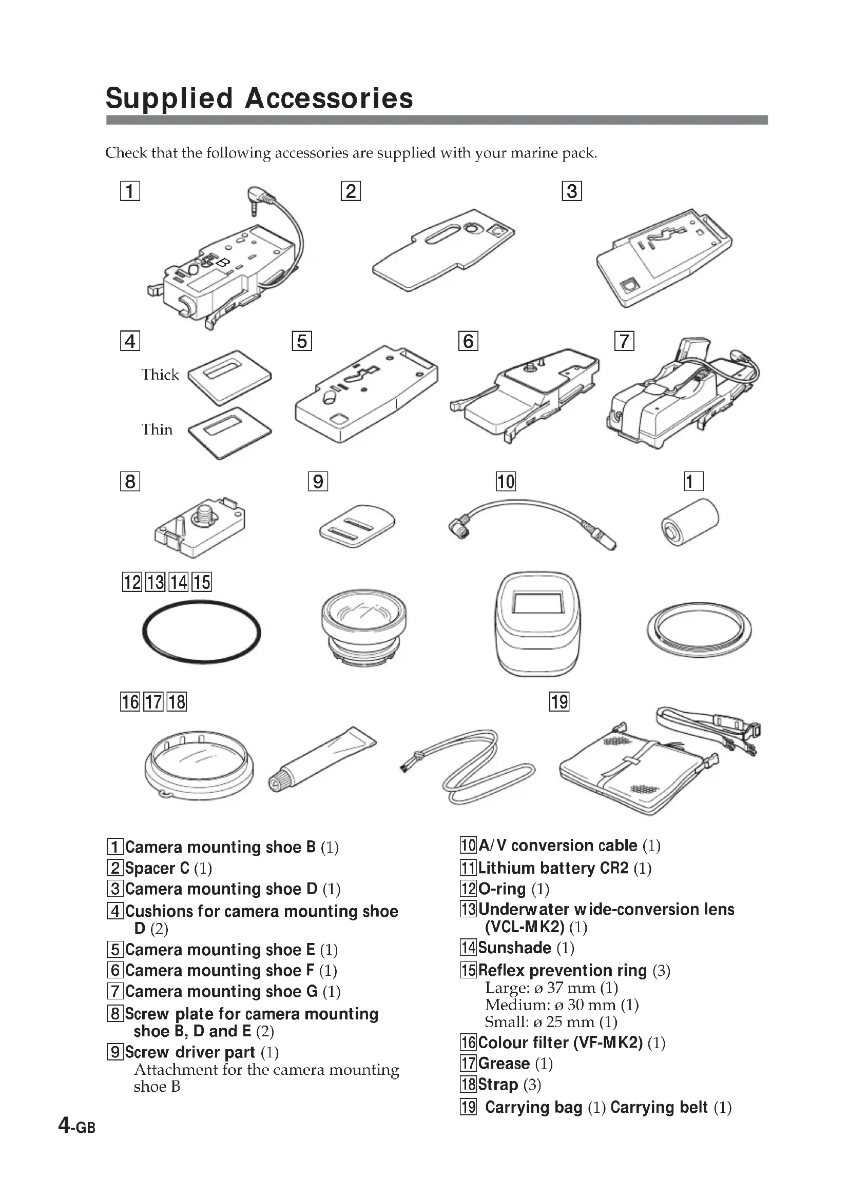 - Specifications -GB Supplied Accessories Check that the following accessories are supplied with your marine pack. 1 Camera mounting shoe B (1) 2 Spacer C (1) 3 Camera mounting shoe D (1) 4 Cushions for camera mounting shoe D (2) 5 Camera mounting shoe E (1) 6 Camera mounting shoe F (1) 7 Camera mounting shoe G (1) 8 Screw plate for camera mounting shoe B, D and E (2) 9 Screw driver part (1) Attachment for the camera mounting shoe B 0 A/V conversion cable (1) qa Lithium battery CR2 (1) qs O-ring (1) qd Underwater wide-conversion lens (VCL-MK2) (1) qf Sunshade (1) qg Reflex prevention ring (3) Large: ø 37 mm (1) Medium: ø 30 mm (1) Small: ø 25 mm (1) qh Colour filter (VF-MK2) (1) qj Grease (1) qk Strap (3) ql Carrying bag (1) Carrying belt (1) p. 354