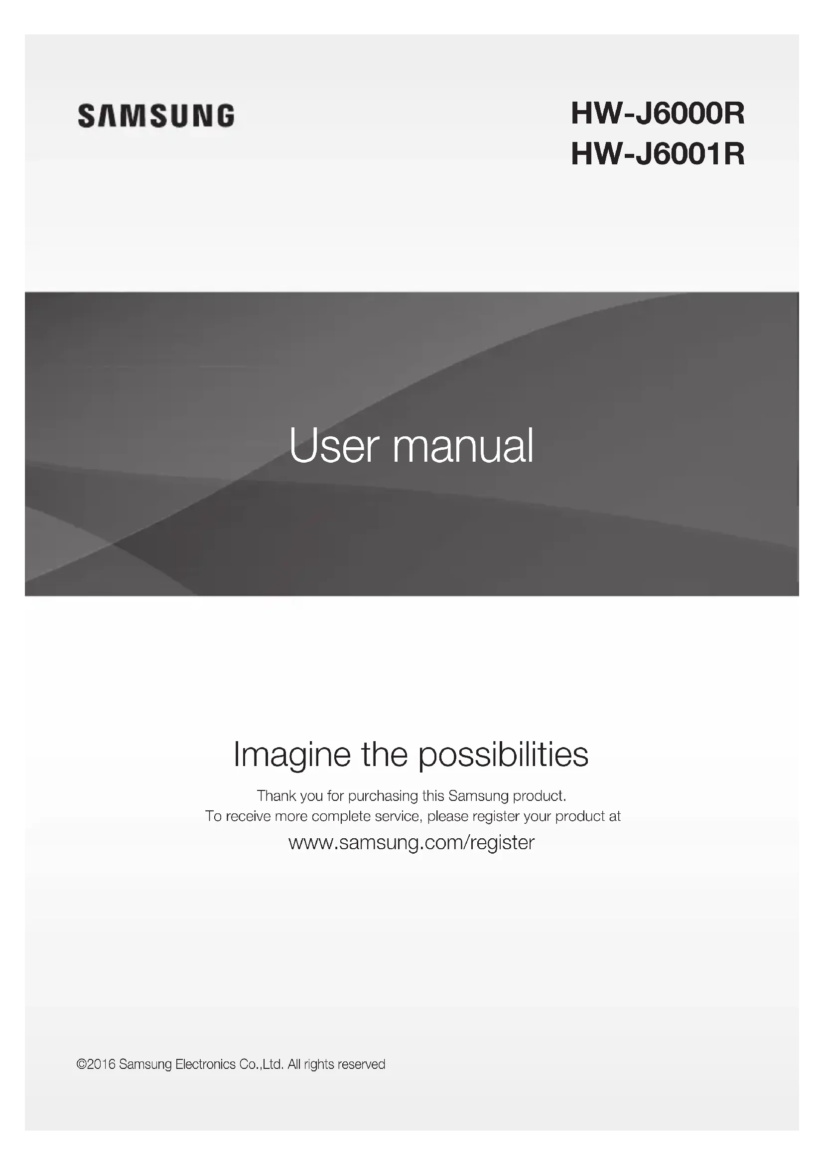 Imagine the possibilities Thank you for purchasing this Samsung product. To receive more complete service, please register your product at www.samsung.com/register User manual HW-J6000R HW-J6001R ©2016 Samsung Electronics Co.,Ltd. All rights reserved2 GETTING STARTED SAFETY INFORMATION SAFETY WARNINGS TO REDUCE THE RISK OF ELECTRIC SHOCK, DO NOT REMOVE THE COVER (OR BACK).NO USER-SERVICEABLE PARTS ARE INSIDE. REFER SERVICING TO QUALIFIED SERVICE PERSONNEL. CAUTION RISK OF ELECTRIC SHOCK. DO NOT OPEN.This symbol indicates that high voltage is present inside. It is dangerous to make any kind of contact with any internal part of this product.This symbol indicates that important literature concerning operation and maintenance has been included with this product.Class II product : This symbol indicates that it does not require a safety connection to electrical earth (ground).AC voltage : This symbol indicates that the rated voltage marked with the symbol is AC voltage.DC voltage : This symbol indicates that the rated voltage marked with the symbol is DC voltage.Caution, Consult instructions for use : This symbol instructs the user to consult the user manual for further safety related information.