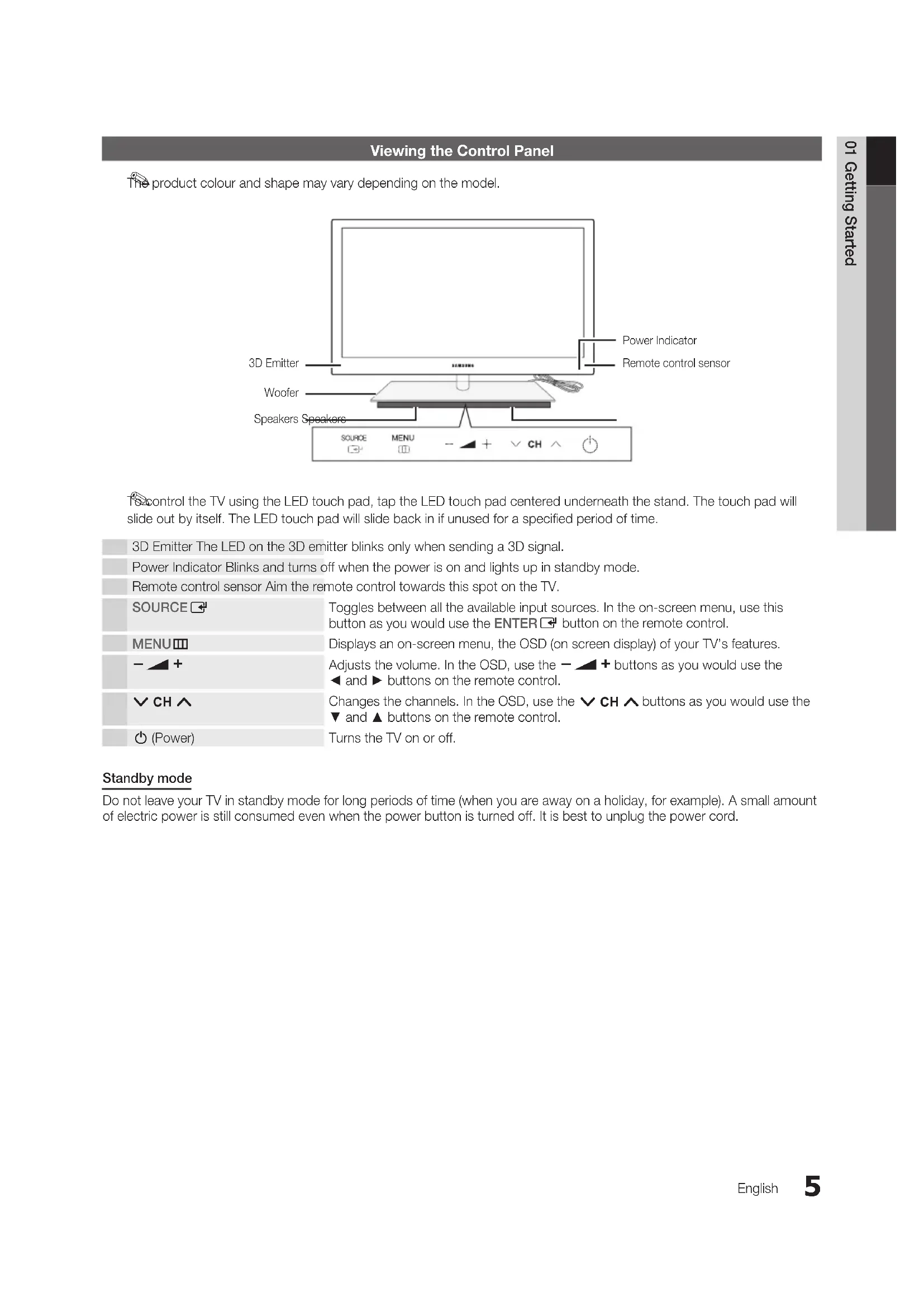 (Power) Turns the TV on or off. Standby mode Do not leave your TV in standby mode for long periods of time (when you are away on a holiday, for example). A small amount of electric power is still consumed even when the power button is turned off. It is best to unplug the power cord. Power Indicator Remote control sensor Speakers Speakers Woofer 3D Emitter [UC9000]BN68-02820J-ZG.indb 5 2010-05-24 오후 8:09:026 Getting Started EnglishMini Remote ControlThe Mini Remote Control is a simplified remote control that consists of the power, channel and volume buttons only. ¦ Description