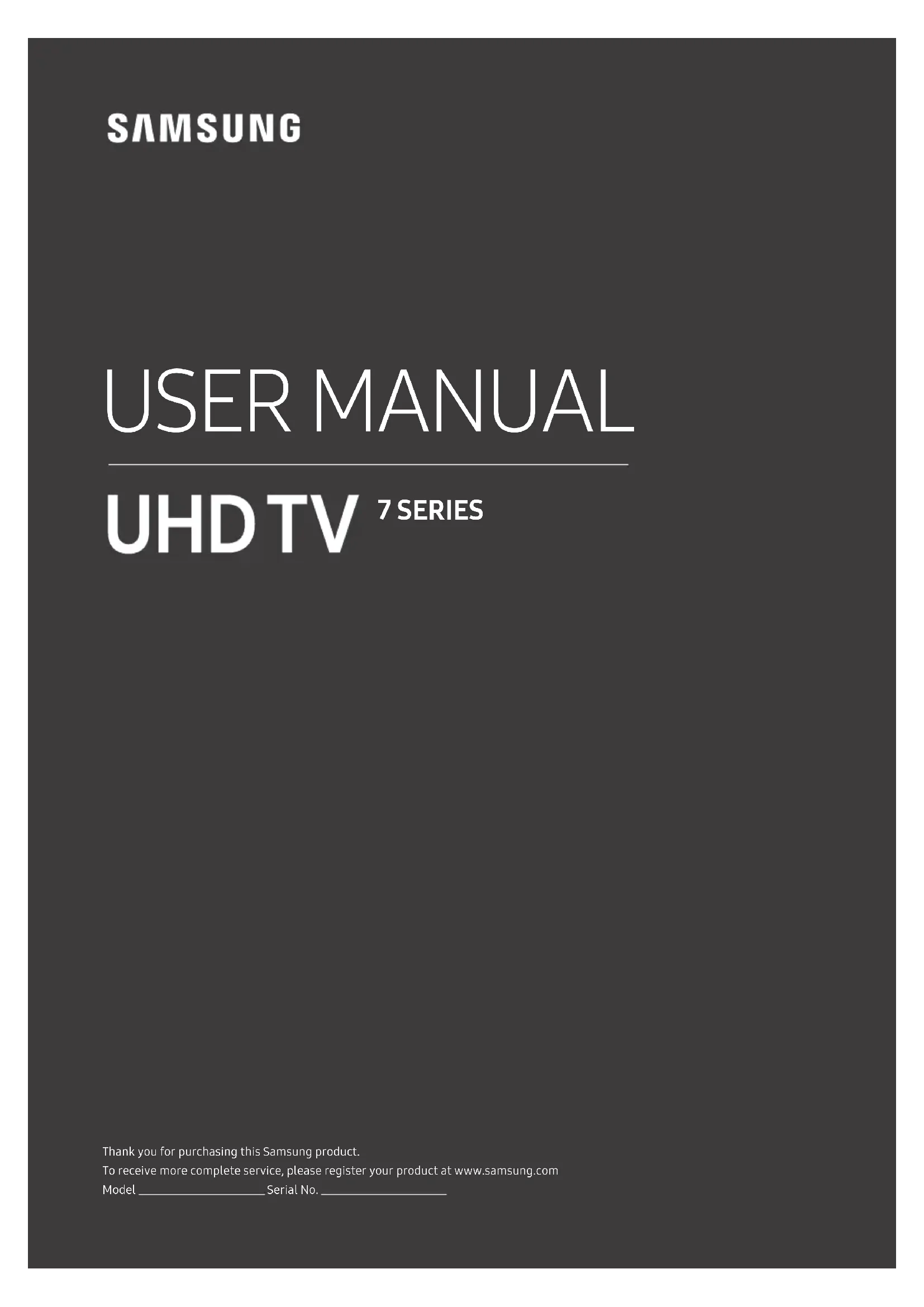 Thank you for purchasing this Samsung product. To receive more complete service, please register your product at www.samsung.com Model Serial No. USER MANUAL 7 SERIESBefore Reading This User Manual This TV comes with this user manual and an embedded e-Manual. Before reading this user manual, review the following: User Manual Read this provided user manual to see information about product safety, installation, accessories, initial configuration, and product specifications. e-Manual For more information about this TV, read the e-Manual embedded in the product.