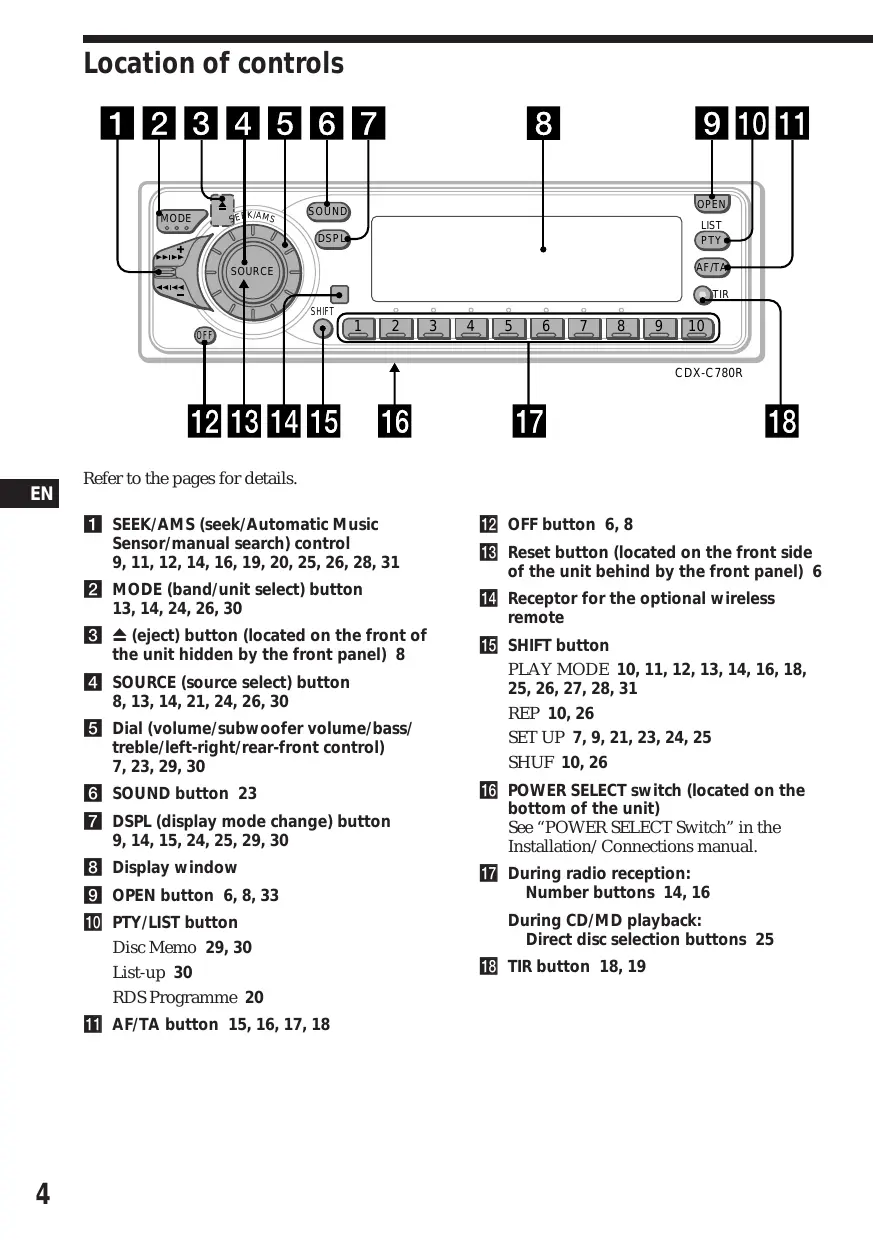 !£ Reset button (located on the front side of the unit behind by the front panel) 6 !¢ Receptor for the optional wireless remote !∞ SHIFT button PLAY MODE 10, 11, 12, 13, 14, 16, 18, 25, 26, 27, 28, 31 REP 10, 26 SET UP 7, 9, 21, 23, 24, 25 SHUF 10, 26 !§ POWER SELECT switch (located on the bottom of the unit) See “POWER SELECT Switch” in the Installation/Connections manual. !¶ During radio reception: Number buttons 14, 16 During CD/MD playback: Direct disc selection buttons 25 !• TIR button 18, 19