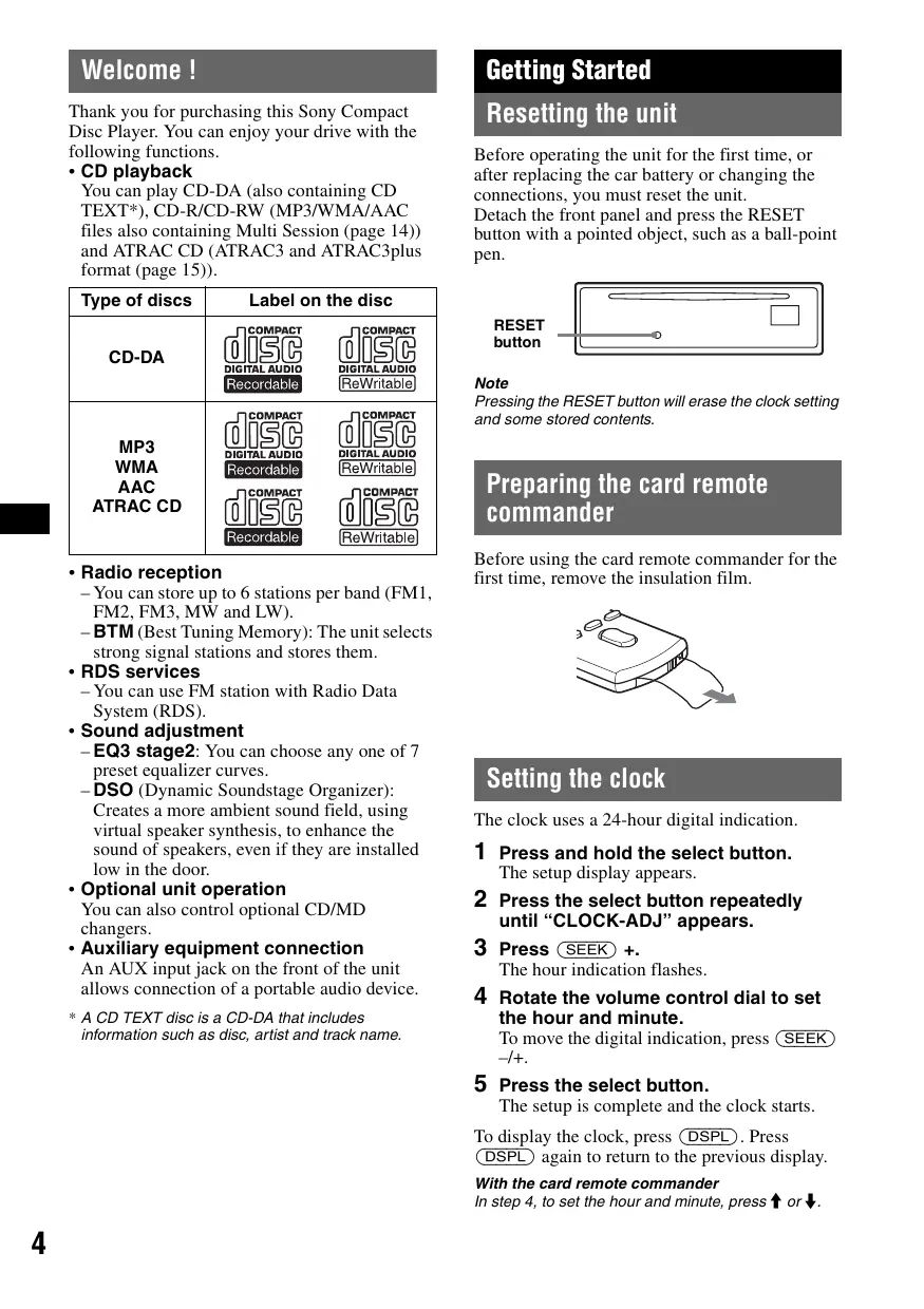 Thank you for purchasing this Sony Compact Disc Player. You can enjoy your drive with the following functions. • CD playback You can play CD-DA (also containing CD TEXT*), CD-R/CD-RW (MP3/WMA/AAC files also containing Multi Session (page 14)) and ATRAC CD (ATRAC3 and ATRAC3plus format (page 15)). Type of discs