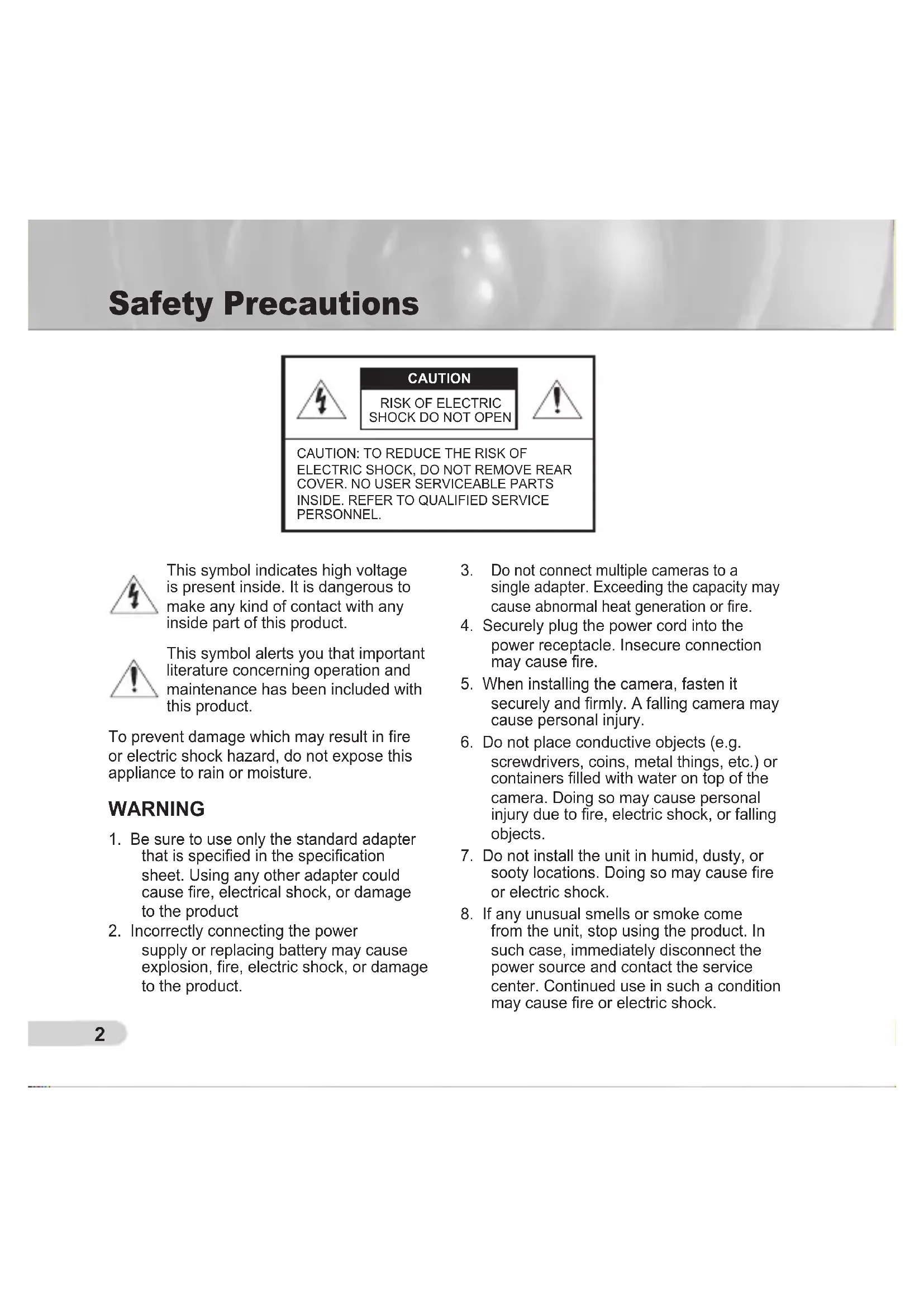 from the unit, stop using the product. In such case, immediately disconnect the power source and contact the service center. Continued use in such a condition may cause fire or electric shock. Safety Precautions CAUTION: TO REDUCE THE RISK OF ELECTRIC SHOCK, DO NOT REMOVE REAR COVER. NO USER SERVICEABLE PARTS INSIDE. REFER TO QUALIFIED SERVICE PERSONNEL. CAUTION