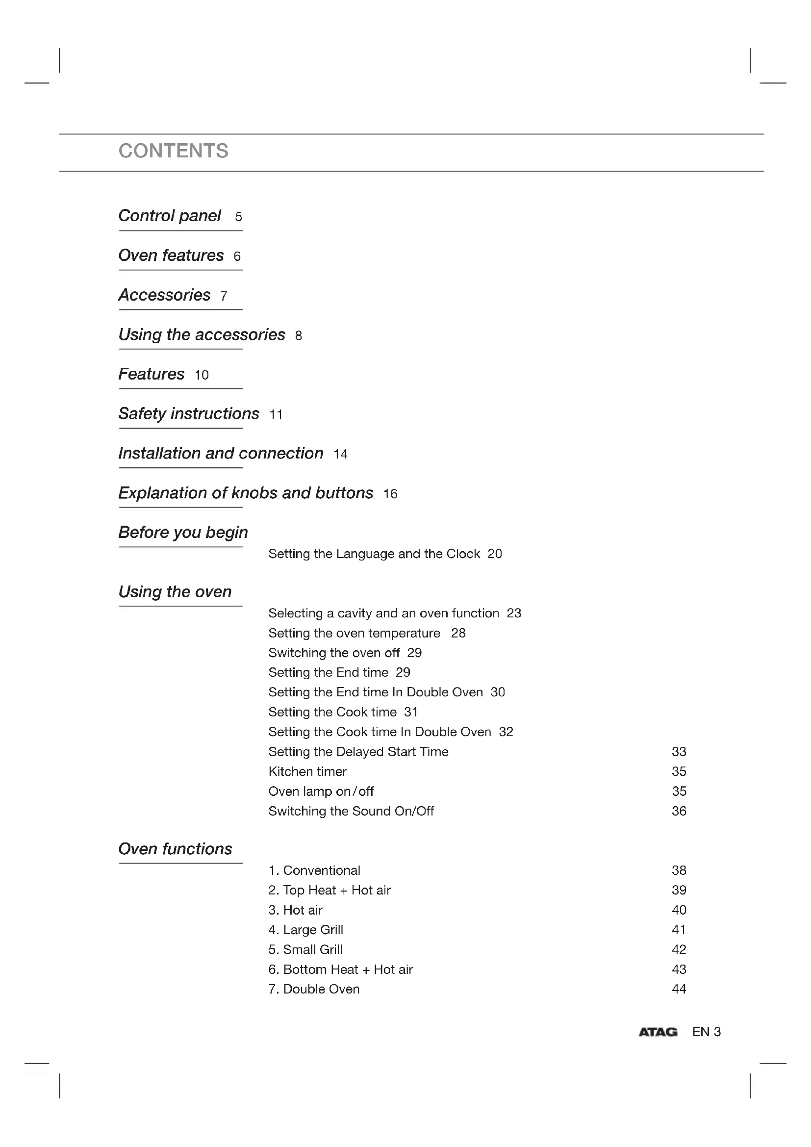 - This oven’s electrical circuitry features a thermal shut off system. If the oven heats to abnormally high temperatures, the system will shut off the power supply to the heating elements for a period of time. Cooling fan During cooking, it is normal for the vent to release Hot air from the front of the oven. The cooling fan will also continue to operate after the oven has been in use. It will turn off when the internal cabinet temperature has dropped to 60 °C or after 22 minutes. Thank you for purchasing an ATAG built-in oven. First read the user instructions carefully and completely before starting to use the appliance, and keep them carefully for future reference. FEATURESEN 11 SAFETY INSTRUCTIONS Installation of this oven must be performed only by a licensed electrician. The installer is responsible for connecting the appliance to the mains power supply in observance of the relevant safety recommendations. Electrical safety
