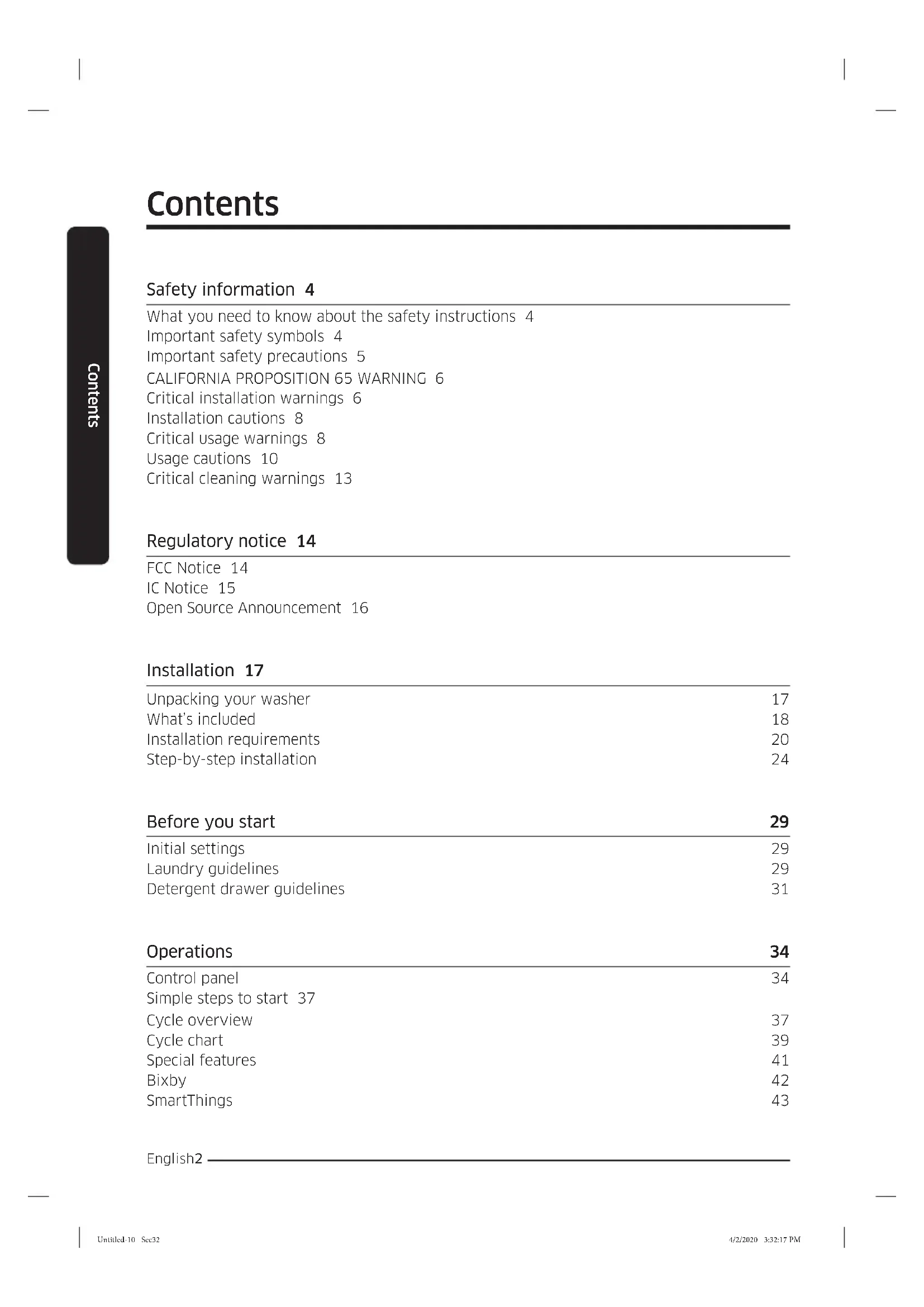Critical installation warnings 6 Installation cautions 8 Critical usage warnings 8 Usage cautions 10 Critical cleaning warnings 13 Regulatory notice 14 FCC Notice 14 IC Notice 15 Open Source Announcement 16 Installation 17 Unpacking your washer 17 What’s included 18 Installation requirements 20 Step-by-step installation 24 Before you start 29 Initial settings 29 Laundry guidelines 29 Detergent drawer guidelines 31 Operations 34 Control panel 34 Simple steps to start 37 Cycle overview 37 Cycle chart 39 Special features 41 Bixby 42 SmartThings 43 Untitled-10 Sec32Untitled-10 Sec32 4/2/2020 3:32:17 PM4/2/2020 3:32:17 PMEnglish 3 Contents Maintenance 44 Self Clean 44 Smart Care 45 Emergency drain 46 Cleaning 47 Recovery from freezing 50 Care for an extended period of non-use 51 Cleaning the exterior 51 Cleaning the interior 51 Troubleshooting 52 Checkpoints 52 Information codes 56 Specications 58 Fabric care chart 58 Protecting the environment 59 Declaration of conformity 59 Specication sheet 60 Untitled-10 Sec33Untitled-10 Sec33 4/2/2020 3:32:17 PM4/2/2020 3:32:17 PMSAVE THESE INSTRUCTIONS English4 Safety information Congratulations on your new Samsung washer. This manual contains important information on the installation, use and care of your appliance. Please take some time to read this manual to take full advantage of your washer’s many benets and features. What you need to know about the safety instructions Please read this manual thoroughly to ensure that you know how to safely and efciently operate the extensive features and functions of your new appliance. Please store the manual in a safe location close to the appliance for future reference. Use this appliance only for its intended purpose as described in this instruction manual. Warnings and Important Safety Instructions in this manual do not cover all possible conditions and situations that may occur. It is your responsibility to use common sense, caution and care when installing, maintaining and operating your washer. Because the following operating instructions cover various models, the characteristics of your washer may differ slightly from those described in this manual and not all warning signs may be applicable. If you have any questions or concerns, contact your nearest service center or nd help and information online at www.samsung.com. Important safety symbols What the icons and signs in this user manual mean: WARNING Hazards or unsafe practices that may result in severe personal injury, death and/or property damage. CAUTION Hazards or unsafe practices that may result in personal injury and/or property damage. NOTE Indicates that a risk of personal injury or material damage exists. These warning signs are here to prevent injury to yourself and others. Please follow them explicitly. After reading this manual, store it in a safe place for future reference. Read all instructions before using the appliance. As with any equipment that uses electricity and moving parts, potential hazards exist. To safely operate this appliance, familiarize yourself with its operation and exercise care when using it. Safety information Untitled-10 4Untitled-10 4 4/2/2020 3:32:18 PM4/2/2020 3:32:18 PMSAVE THESE INSTRUCTIONS English 5 Safety information Important safety precautions WARNING To reduce the risk of re, electric shock, or injury to persons when using your appliance, follow basic precautions, including the following: