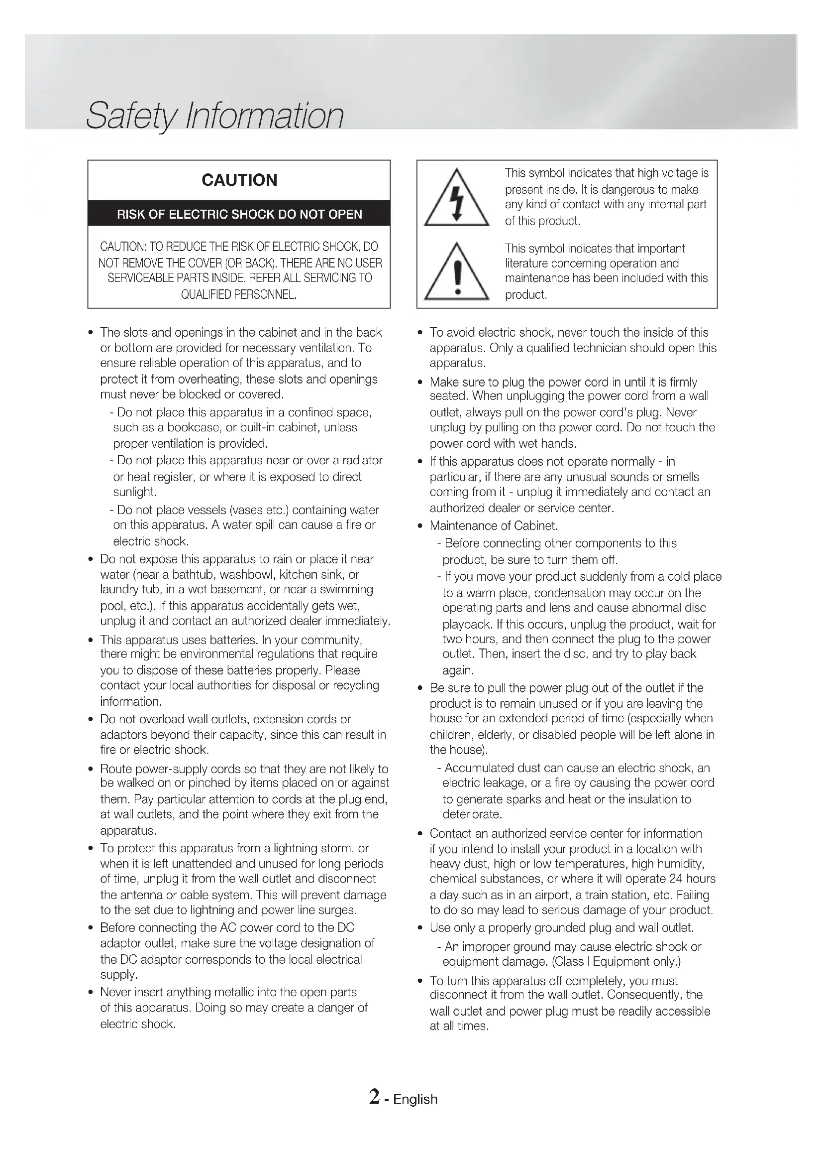 - The slots and openings in the cabinet and in the back or bottom are provided for necessary ventilation. To ensure reliable operation of this apparatus, and to protect it from overheating, these slots and openings must never be blocked or covered. - Do not place this apparatus in a confined space, such as a bookcase, or built-in cabinet, unless proper ventilation is provided. - Do not place this apparatus near or over a radiator or heat register, or where it is exposed to direct sunlight. - Do not place vessels (vases etc.) containing water on this apparatus. A water spill can cause a fire or electric shock.• Do not expose this apparatus to rain or place it near water (near a bathtub, washbowl, kitchen sink, or laundry tub, in a wet basement, or near a swimming pool, etc.). If this apparatus accidentally gets wet, unplug it and contact an authorized dealer immediately.• This apparatus uses batteries. In your community, there might be environmental regulations that require you to dispose of these batteries properly. Please contact your local authorities for disposal or recycling information.• Do not overload wall outlets, extension cords or adaptors beyond their capacity, since this can result in fire or electric shock.• Route power-supply cords so that they are not likely to be walked on or pinched by items placed on or against them. Pay particular attention to cords at the plug end, at wall outlets, and the point where they exit from the apparatus.• To protect this apparatus from a lightning storm, or when it is left unattended and unused for long periods of time, unplug it from the wall outlet and disconnect the antenna or cable system. This will prevent damage to the set due to lightning and power line surges.• Before connecting the AC power cord to the DC adaptor outlet, make sure the voltage designation of the DC adaptor corresponds to the local electrical supply.• Never insert anything metallic into the open parts of this apparatus. Doing so may create a danger of electric shock.• To avoid electric shock, never touch the inside of this apparatus. Only a qualified technician should open this apparatus.• Make sure to plug the power cord in until it is firmly seated. When unplugging the power cord from a wall outlet, always pull on the power cord's plug. Never unplug by pulling on the power cord. Do not touch the power cord with wet hands.• If this apparatus does not operate normally - in particular, if there are any unusual sounds or smells coming from it - unplug it immediately and contact an authorized dealer or service center.• Maintenance of Cabinet. - Before connecting other components to this product, be sure to turn them off. - If you move your product suddenly from a cold place to a warm place, condensation may occur on the operating parts and lens and cause abnormal disc playback. If this occurs, unplug the product, wait for two hours, and then connect the plug to the power outlet. Then, insert the disc, and try to play back again.• Be sure to pull the power plug out of the outlet if the product is to remain unused or if you are leaving the house for an extended period of time (especially when children, elderly, or disabled people will be left alone in the house). - Accumulated dust can cause an electric shock, an electric leakage, or a fire by causing the power cord to generate sparks and heat or the insulation to deteriorate.• Contact an authorized service center for information if you intend to install your product in a location with heavy dust, high or low temperatures, high humidity, chemical substances, or where it will operate 24 hours a day such as in an airport, a train station, etc. Failing to do so may lead to serious damage of your product.• Use only a properly grounded plug and wall outlet. - An improper ground may cause electric shock or equipment damage. (Class l Equipment only.)• To turn this apparatus off completely, you must disconnect it from the wall outlet. Consequently, the wall outlet and power plug must be readily accessible at all times. CAUTION RISK OF ELECTRIC SHOCK DO NOT OPENCAUTION: TO REDUCE THE RISK OF ELECTRIC SHOCK, DO NOT REMOVE THE COVER (OR BACK). THERE ARE NO USER SERVICEABLE PARTS INSIDE. REFER ALL SERVICING TO QUALIFIED PERSONNEL.This symbol indicates that high voltage is present inside. It is dangerous to make any kind of contact with any internal part of this product.This symbol indicates that important literature concerning operation and maintenance has been included with this product. HT-H6500WM_30WM_ZC-0514.indd 2HT-H6500WM_30WM_ZC-0514.indd 2 2014-05-15 11:52:332014-05-15 11:52:333 - English Safety Information