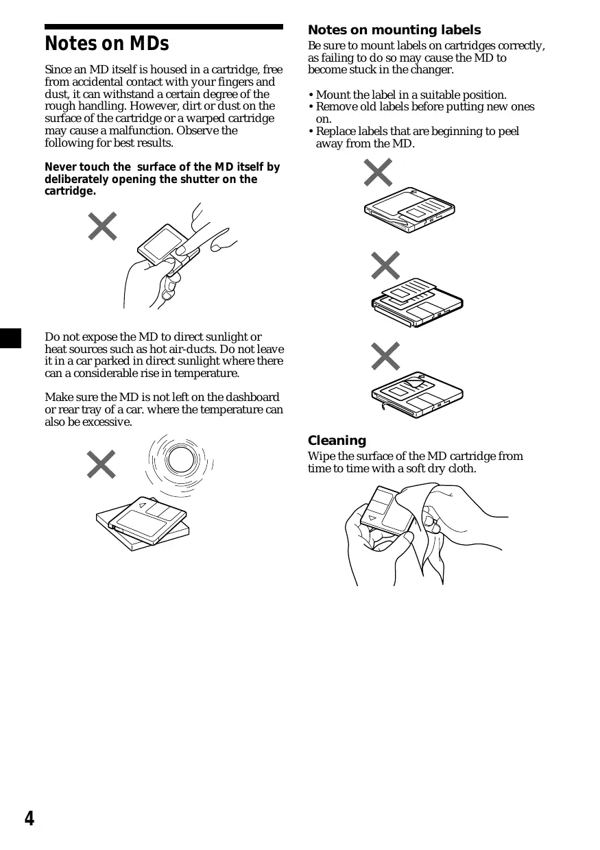 Since an MD itself is housed in a cartridge, free from accidental contact with your fingers and dust, it can withstand a certain degree of the rough handling. However, dirt or dust on the surface of the cartridge or a warped cartridge may cause a malfunction. Observe the following for best results.