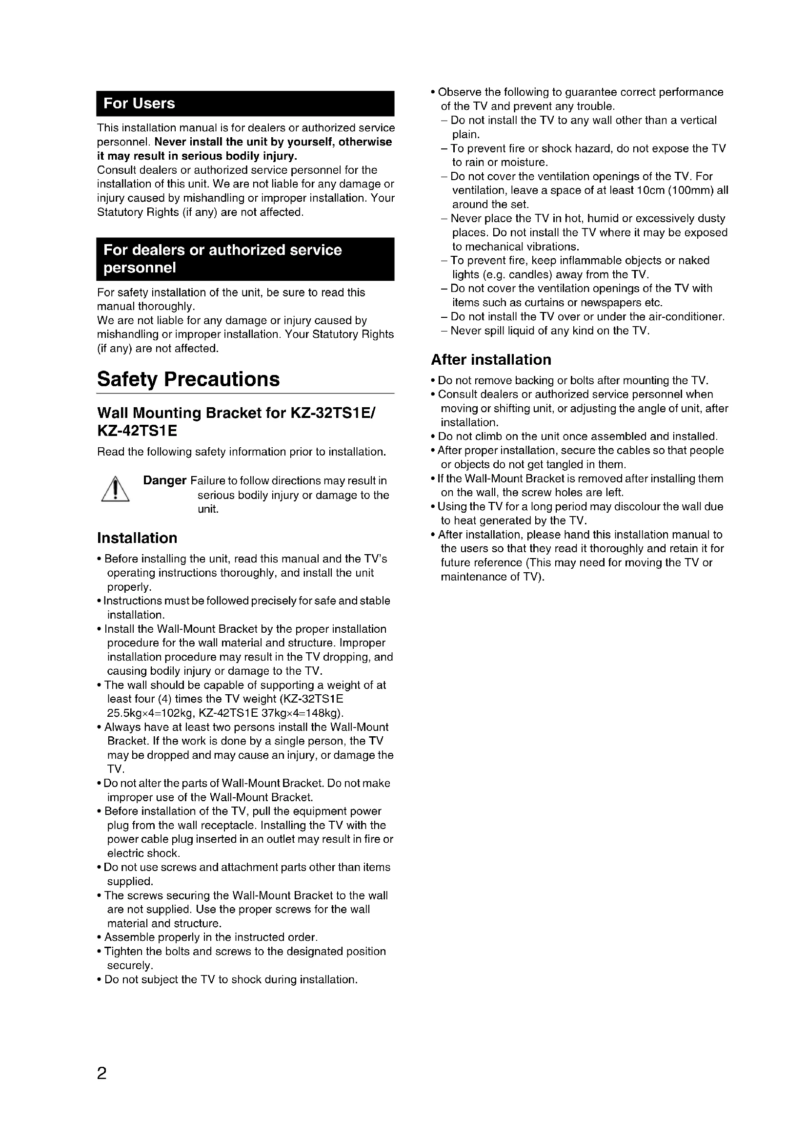 - The wall should be capable of supporting a weight of at least four (4) times the TV weight (KZ-32TS1E 25.5kg× 4 = 102kg , KZ-42TS1E 37kg× 4 = 148kg ).