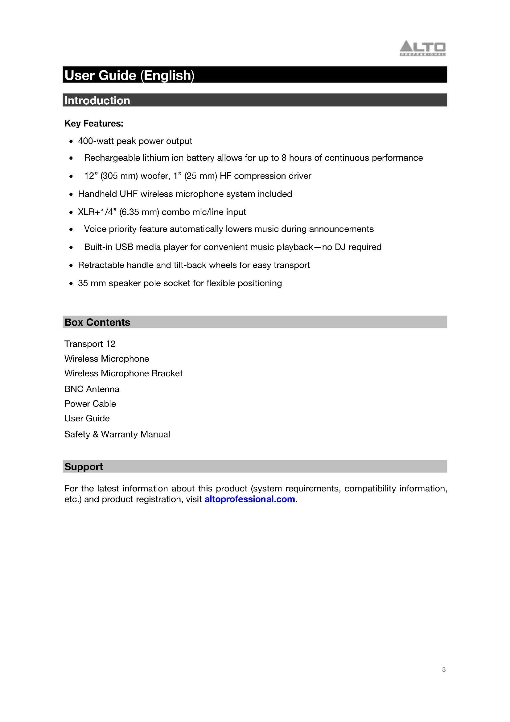 Support For the latest information about this product (system requirements, compatibility information, etc.) and product registration, visit altoprofessional.com.4