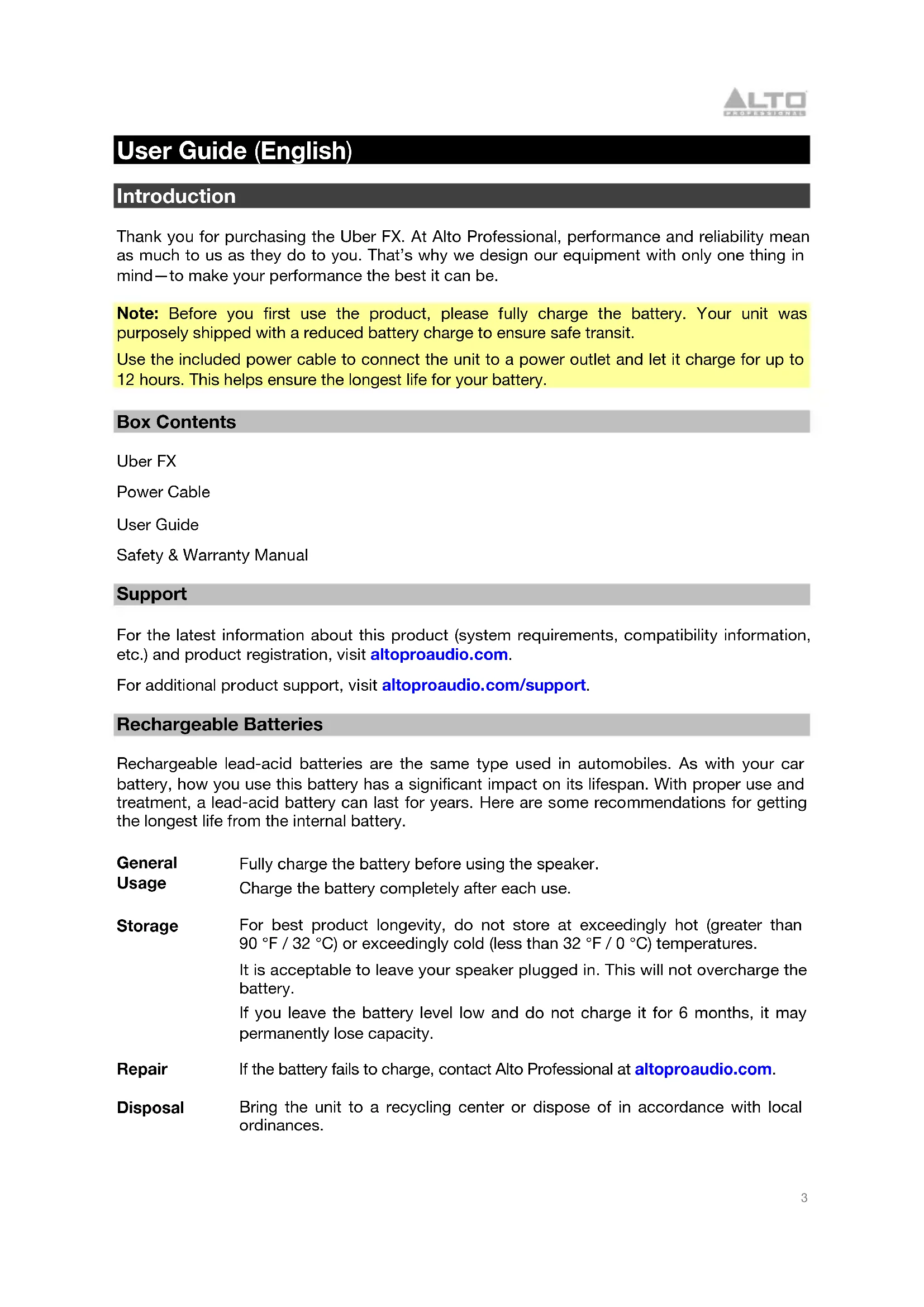 Thank you for purchasing the Uber FX. At Alto Professional, performance and reliability mean as much to us as they do to you. That's why we design our equipment with only one thing in mind—to make your performance the best it can be.