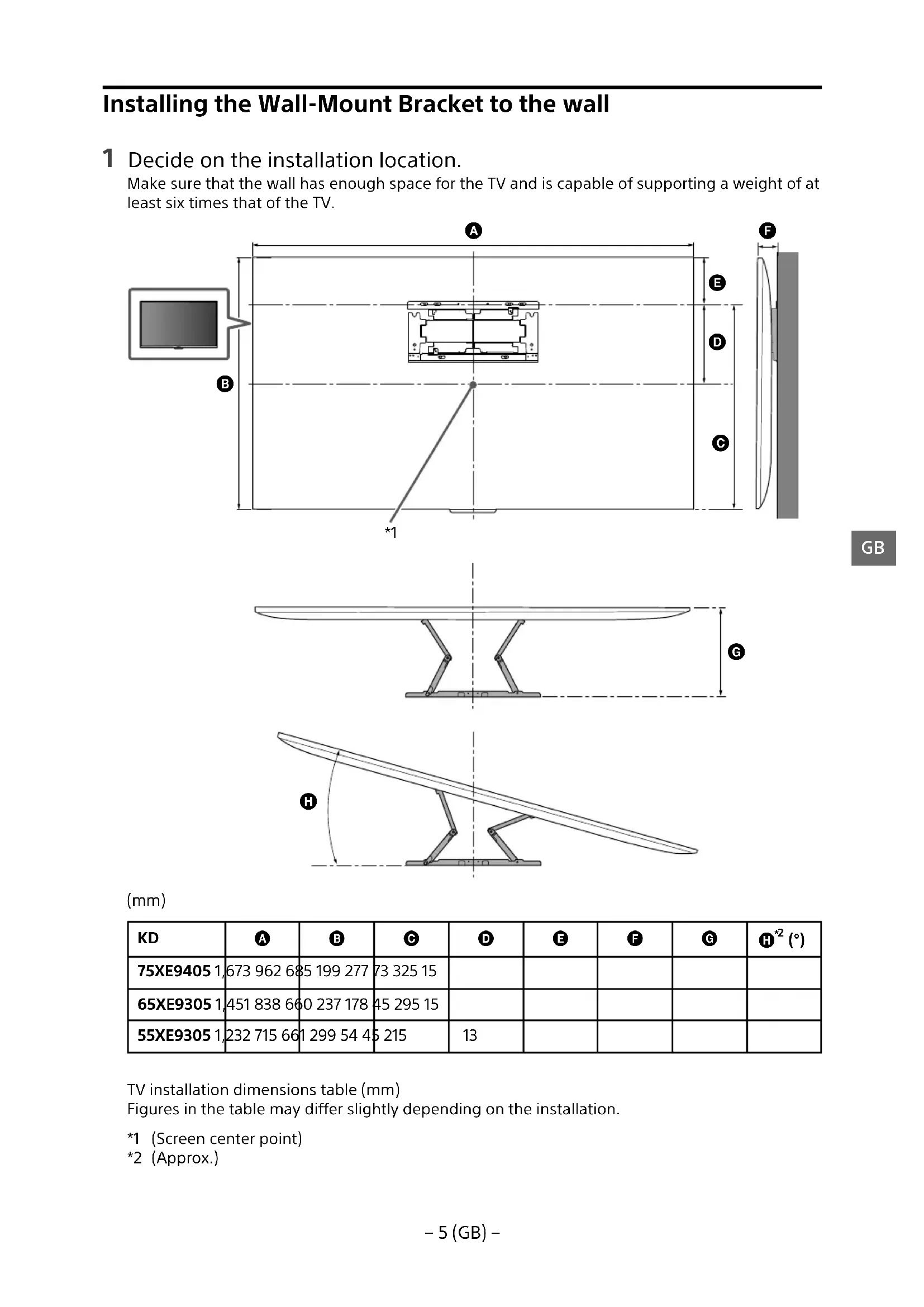 Installing the Wall-Mount Bracket to the wall 1 Decide on the installation location. Make sure that the wall has enough space for the TV and is capable of supporting a weight of at least six times that of the TV.