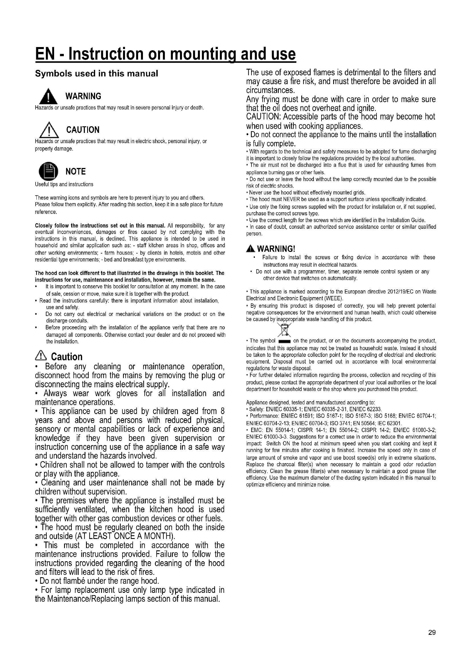 NOTE Useful tips and instructions These warning icons and symbols are here to prevent injury to you and others. Please follow them explicitly. After reading this section, keep it in a safe place for future reference. Closely follow the instructions set out in this manual. All responsibility, for any eventual inconveniences, damages or fires caused by not complying with the instructions in this manual, is declined. This appliance is intended to be used in household and similar application such as: - staff kitchen areas in shop, offices and other working environments; - farm houses; - by clients in hotels, motels and other residential type environments; - bed and breakfast type environments. The hood can look different to that illustrated in the drawings in this booklet. The instructions for use, maintenance and installation, however, remain the same.