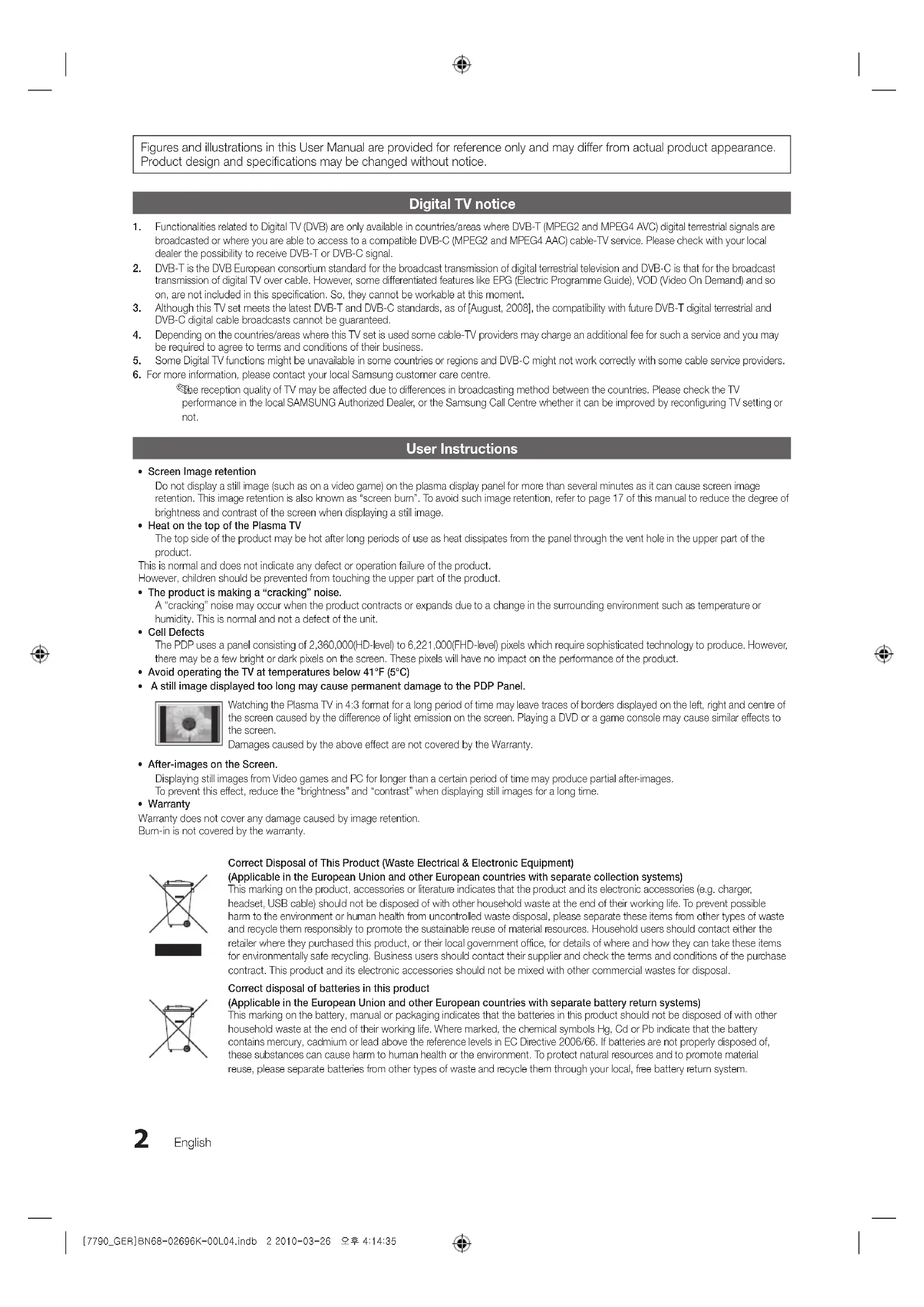 - Warranty Warranty does not cover any damage caused by image retention. Burn-in is not covered by the warranty. Correct Disposal of This Product (Waste Electrical & Electronic Equipment) (Applicable in the European Union and other European countries with separate collection systems) This marking on the product, accessories or literature indicates that the product and its electronic accessories (e.g. charger, headset, USB cable) should not be disposed of with other household waste at the end of their working life. To prevent possible harm to the environment or human health from uncontrolled waste disposal, please separate these items from other types of waste and recycle them responsibly to promote the sustainable reuse of material resources. Household users should contact either the retailer where they purchased this product, or their local government office, for details of where and how they can take these items for environmentally safe recycling. Business users should contact their supplier and check the terms and conditions of the purchase contract. This product and its electronic accessories should not be mixed with other commercial wastes for disposal. Correct disposal of batteries in this product (Applicable in the European Union and other European countries with separate battery return systems) This marking on the battery, manual or packaging indicates that the batteries in this product should not be disposed of with other household waste at the end of their working life. Where marked, the chemical symbols Hg, Cd or Pb indicate that the battery contains mercury, cadmium or lead above the reference levels in EC Directive 2006/66. If batteries are not properly disposed of, these substances can cause harm to human health or the environment. To protect natural resources and to promote material reuse, please separate batteries from other types of waste and recycle them through your local, free battery return system. [7790_GER]BN68-02696K-00L04.indb 2 2010-03-26 오후 4:14:353 ENGLISH English Contents Getting Started