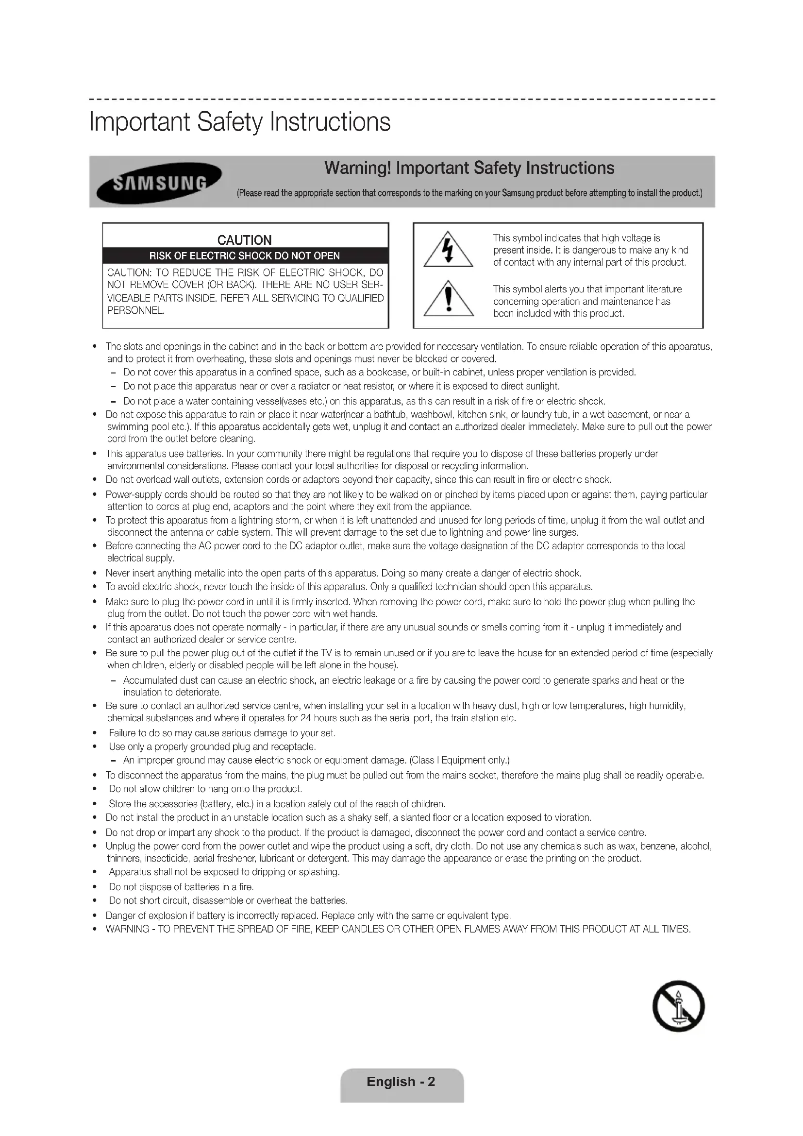 - Caution The glass screen of your PDP TV can break if you accidently drop the TV. Handle the TV with care. When moving the TV, always have two or more people pick it up and carry it as a safety precaution. Do not lay the TV flat on its face or back. Your Samsung Plasma TV is a high quality television that has been carefully packaged to protect the integrity of its glass panel and component parts during shipment. It is, nonetheless, a fragile piece of electronics that requires careful handling. Refrain from putting undue stress on any part of the packaging when shipping or unpacking the TV. Use care when installing the TV. Avoid placing the TV in a location where it may be struck, exposed to sharp impacts, or fall. Panel breakage caused by a fall or impact strike is not covered under the manufacturer's warranty. [PF8500-ZG]BN68-04828D-01L04.indb 25 2013-03-16 6:58:01Deutsch - 2 Wichtige Sicherheitshinweise Achtung! Wichtige Sicherheitshinweise (Bitte lesen Sie den Ihrem Samsung Gerät entsprechenden Abschnitt, bevor Sie dieses installieren.) ACHTUNG ACHTUNG: UM DIE GEFAHR EINES ELEKTRISCHEN SCHLAGES ZU VER- RINGERN, ENTFERNEN SIE NICHT DIE ABDECKUNG (ODER RÜCKSEITE). ES BEFINDEN SICH IM INNEREN KEINE TEILE, DIE VON BENUTZERN GEWARTET WERDEN KÖNNEN. LASSEN SIE REPARATUREN NUR VON QUALIFIZIERTEM KUNDENDIENSTPERSONAL DURCHFÜHREN.
