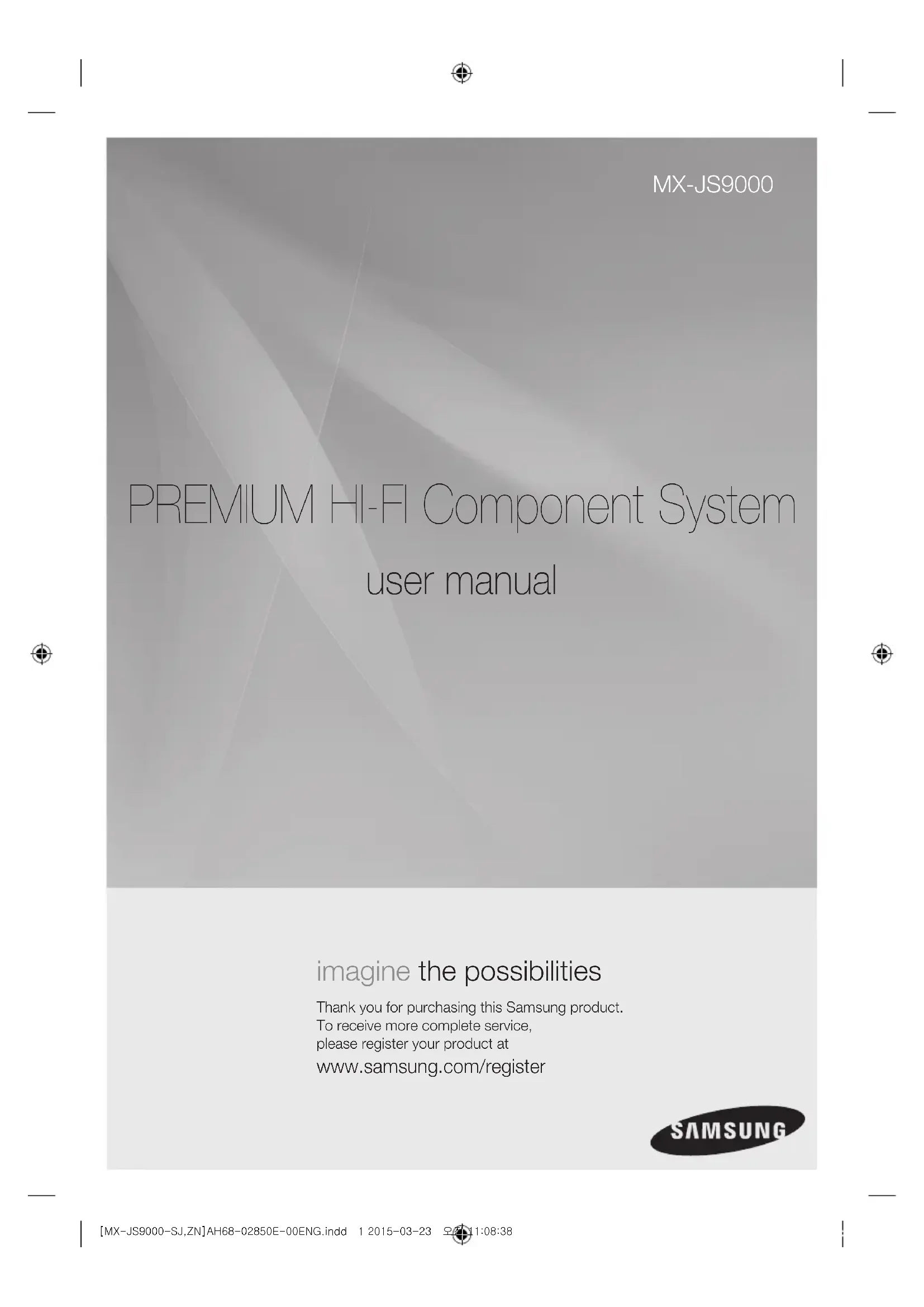 PREMIUM HI-FI Component System user manual MX-JS9000 imagine the possibilities Thank you for purchasing this Samsung product. To receive more complete service, please register your product at www.samsung.com/register [MX-JS9000-SJ,ZN]AH68-02850E-00ENG.indd 1 2015-03-23 오전 11:08:38Safety Information 2 English Warning TO REDUCE THE RISK OF ELECTRIC SHOCK, DO NOT REMOVE THE COVER (OR BACK). NO USER-SERVICEABLE PARTS ARE INSIDE. REFER SERVICING TO QUALIFIED SERVICE PERSONNEL. CAUTION RISK OF ELECTRIC SHOCK DO NOT OPENCAUTION: TO PREVENT ELECTRIC SHOCK, MATCH WIDE BLADE OF PLUG TO WIDE SLOT, FULLY INSERT.This symbol indicates "dangerous voltage" inside the product that presents a risk of electric shock or personal injury.This symbol indicates important instructions accompanying the product. WARNING