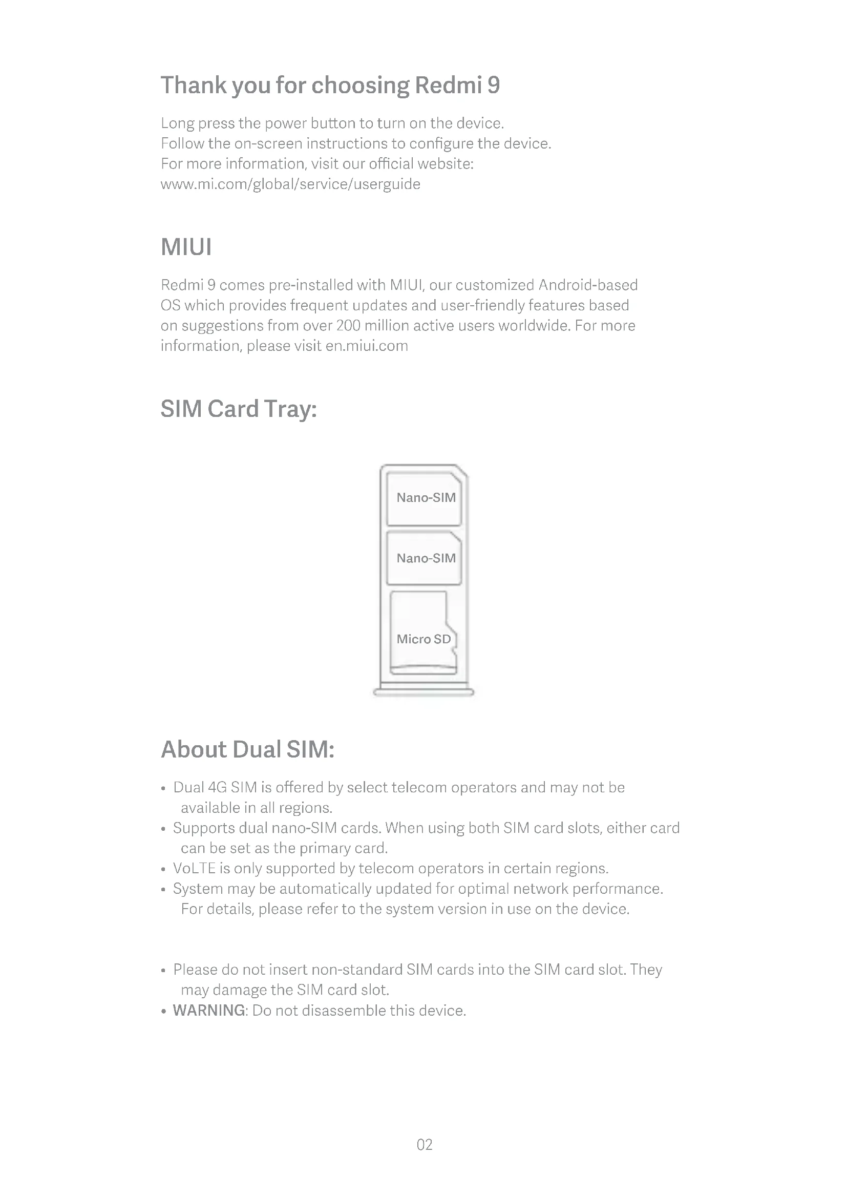 01Thank you for choosing Redmi 9 Long press the power buon to turn on the device. Follow the on-screen instructions to configure the device. For more information, visit our official website: www.mi.com/global/service/userguide MIUI Redmi 9 comes pre-installed with MIUI, our customized Android-based OS which provides frequent updates and user-friendly features based on suggestions from over 200 million active users worldwide. For more information, please visit en.miui.com SIM Card Tray: Micro SD Nano-SIM Nano-SIM About Dual SIM: