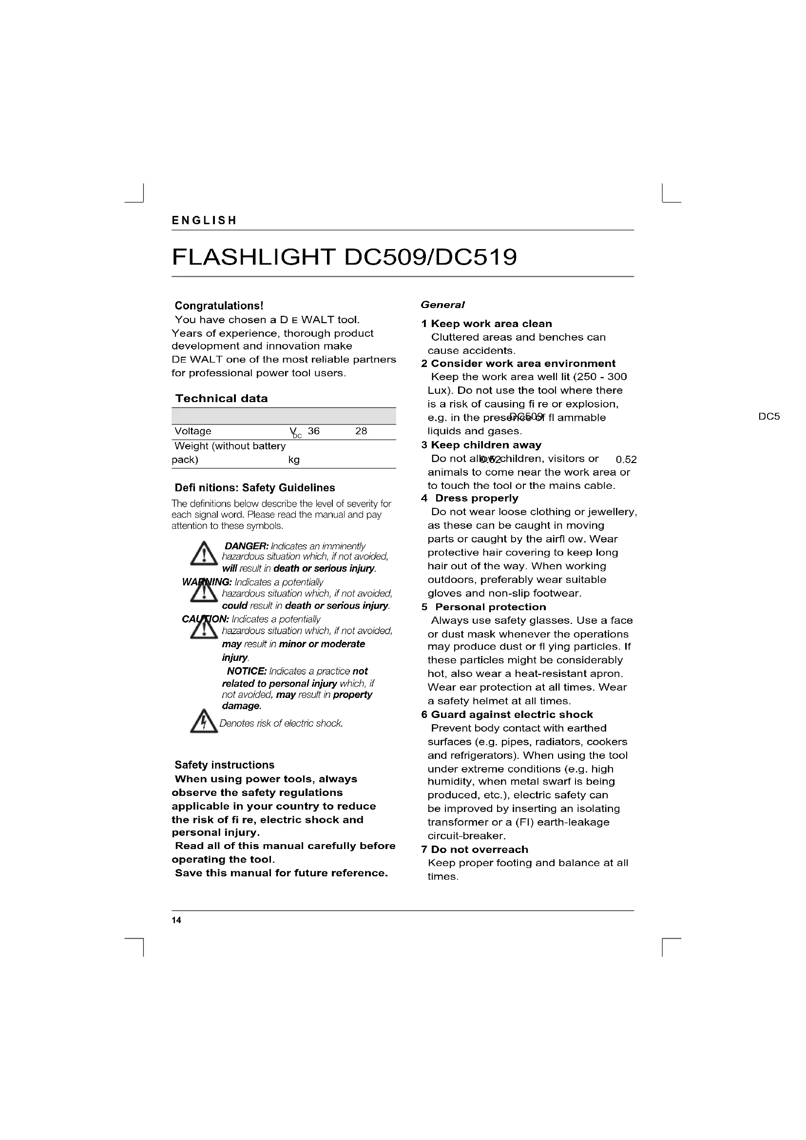 Never modify the fl ashlight or any part of it. Damage or personal injury could result. INTENDED USE The DC509/DC519 heavy-duty fl ashlights are designed to operate on 36 V or 28V battery packs and can be used as a handheld model or as a standing model. DO NOT use under wet conditions or in presence of fl ammable liquids or gases.16 ENGLISH DO NOT let children come into contact with the tool. Supervision is required when inexperienced operators use this tool. 1 On/off switch 2 Base 3 Flexible tube 4 Head 5 Lens 6 Lens holder 7 Battery pack (not included) Electrical safety Always check that the battery pack power corresponds to the voltage on the rating plate. Also make sure that the voltage of your charger corresponds to that of your mains.