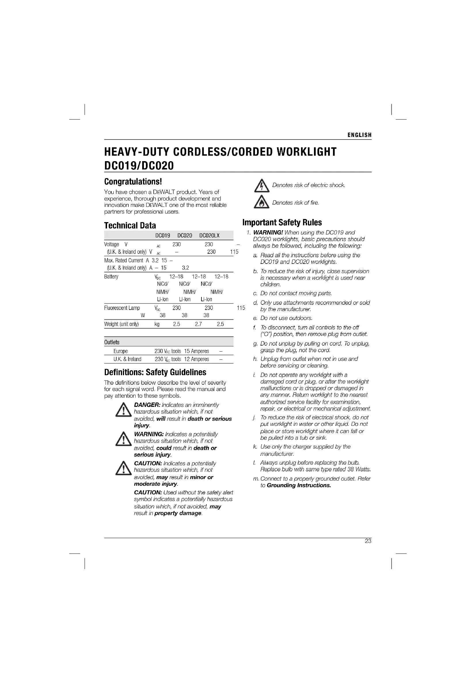 charger. Under proper conditions, they can be stored for up to 5 years. Labels on Battery Pack In addition to the pictographs used in this manual, the labels on the battery pack show the following pictographs: Read instruction manual before use. Do not probe with conductive objects. Do not use damaged battery packs. Use only with DEWALT battery packs, others may burst, causing personal injury and damage. Do not expose to water. Have defective cords replaced immediately. Discard the battery pack with due care for the environment. Do not incinerate the battery pack NiMH, NiCd+ and Li-Ion. Labels on Worklight The following pictograms are shown on the worklight: Read instruction manual before use.ENGLISH