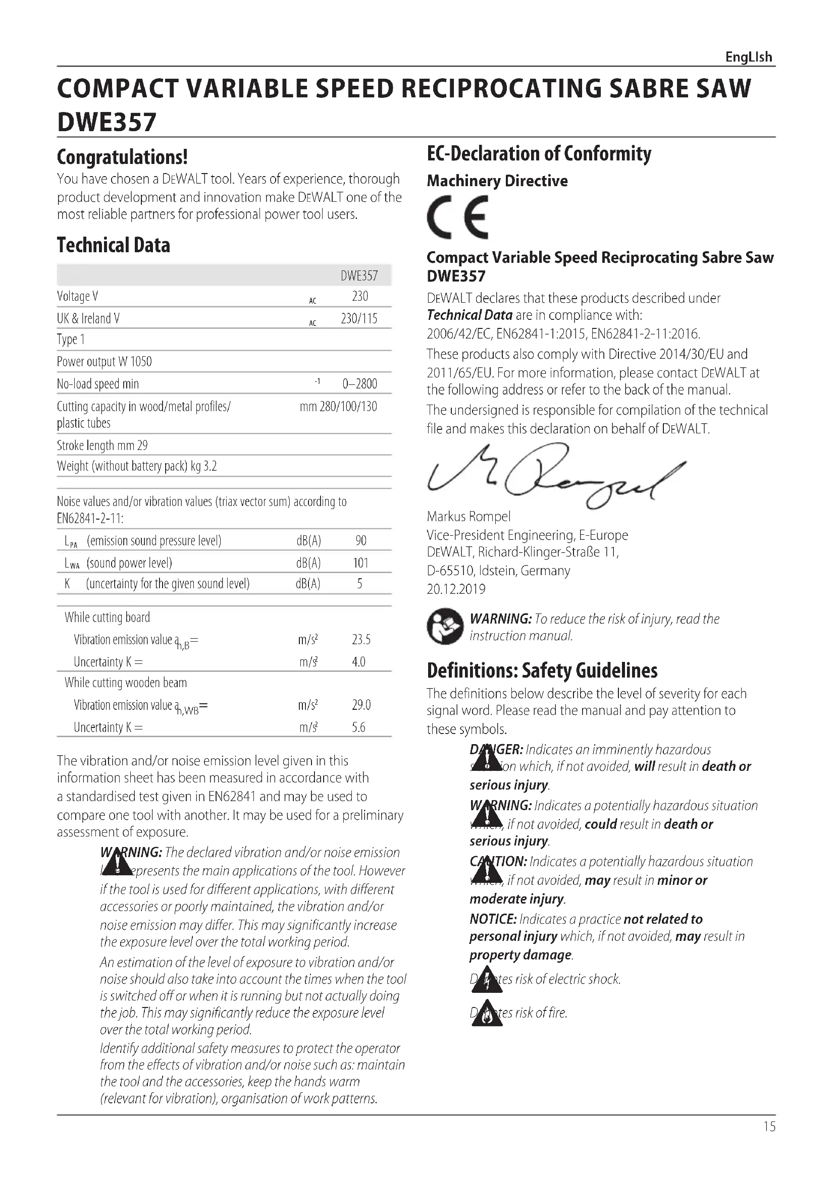 DWE357 EC-Declaration of Conformity Machinery Directive Compact Variable Speed Reciprocating Sabre Saw DWE357 DeWALT declares that these products described under Technical Data are in compliance with: 2006/42/EC, EN62841-1:2015, EN62841-2-11:2016. These products also comply with Directive 2014/30/EU and 2011/65/EU. For more information, please contact DeWALT at the following address or refer to the back of themanual. The undersigned is responsible for compilation of the technical file and makes this declaration on behalf ofDeWALT. Markus Rompel Vice-President Engineering, E-Europe DeWALT, Richard-Klinger-Straße 11, D-65510, Idstein, Germany