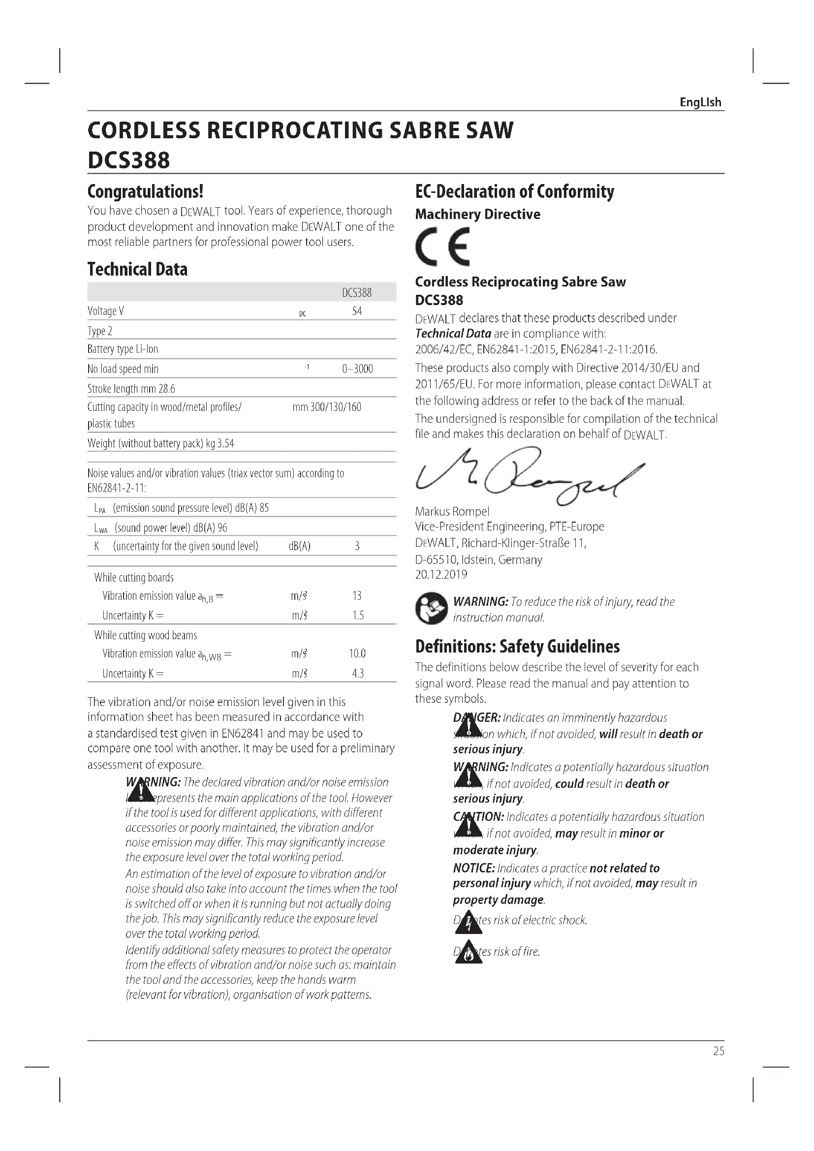 English (original instructions) Congratulations! You have chosen a DeWALT tool. Years of experience, thorough product development and innovation make DeWALT one of the most reliable partners for professional power toolusers. Technical Data EC-Declaration of Conformity Machinery Directive Cordless Reciprocating Sabre Saw DCS388 DeWALT declares that these products described under Technical Data are in compliance with: 2006/42/EC, EN62841-1:2015, EN62841-2-11:2016. These products also comply with Directive 2014/30/EU and 2011/65/EU. For more information, please contact DeWALT