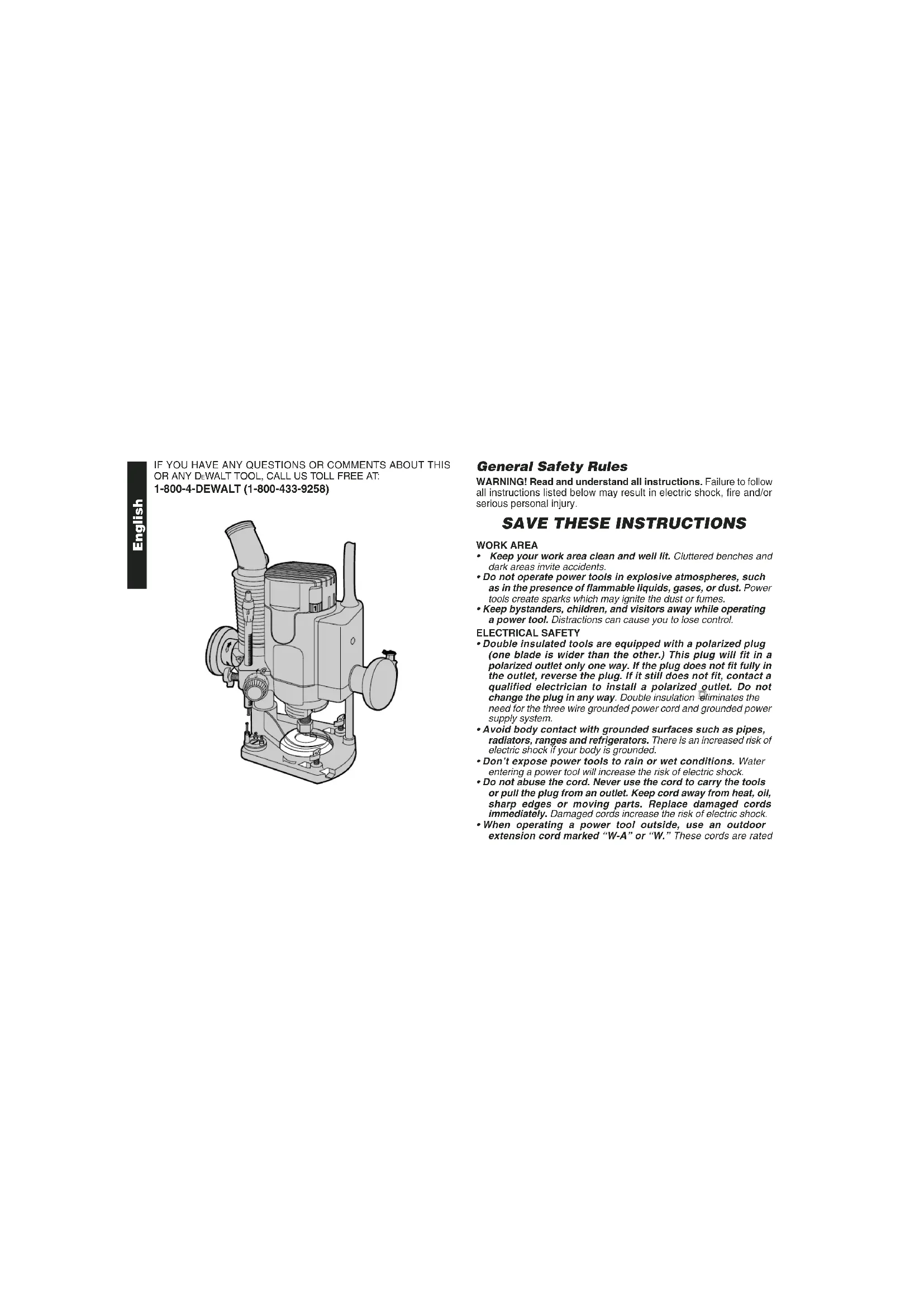 EWALT heavy duty industrial tool, simply return it to the participating seller within 30 days for a full refund. Please return the complete unit, transportation prepaid. Proof of purchase may be required. English See ‘Tools-Electric’ –Yellow Pages– for Service & Sales7 English Your router is equipped with constant speed cutting—as you load the router, the selected cutting speed does not slow down during normal use. The electronic control governs the motor and gives you a consistent finish to your work. Only under very heavy loading will the speed of the unit fall below the governed speed. To set the router speed (from 8,000 rpm to 24,000 rpm) rotate the speed control wheel shown in Fig. 3. The higher the number the higher the speed. Consult the table below to help select the proper speed for your application. Table A