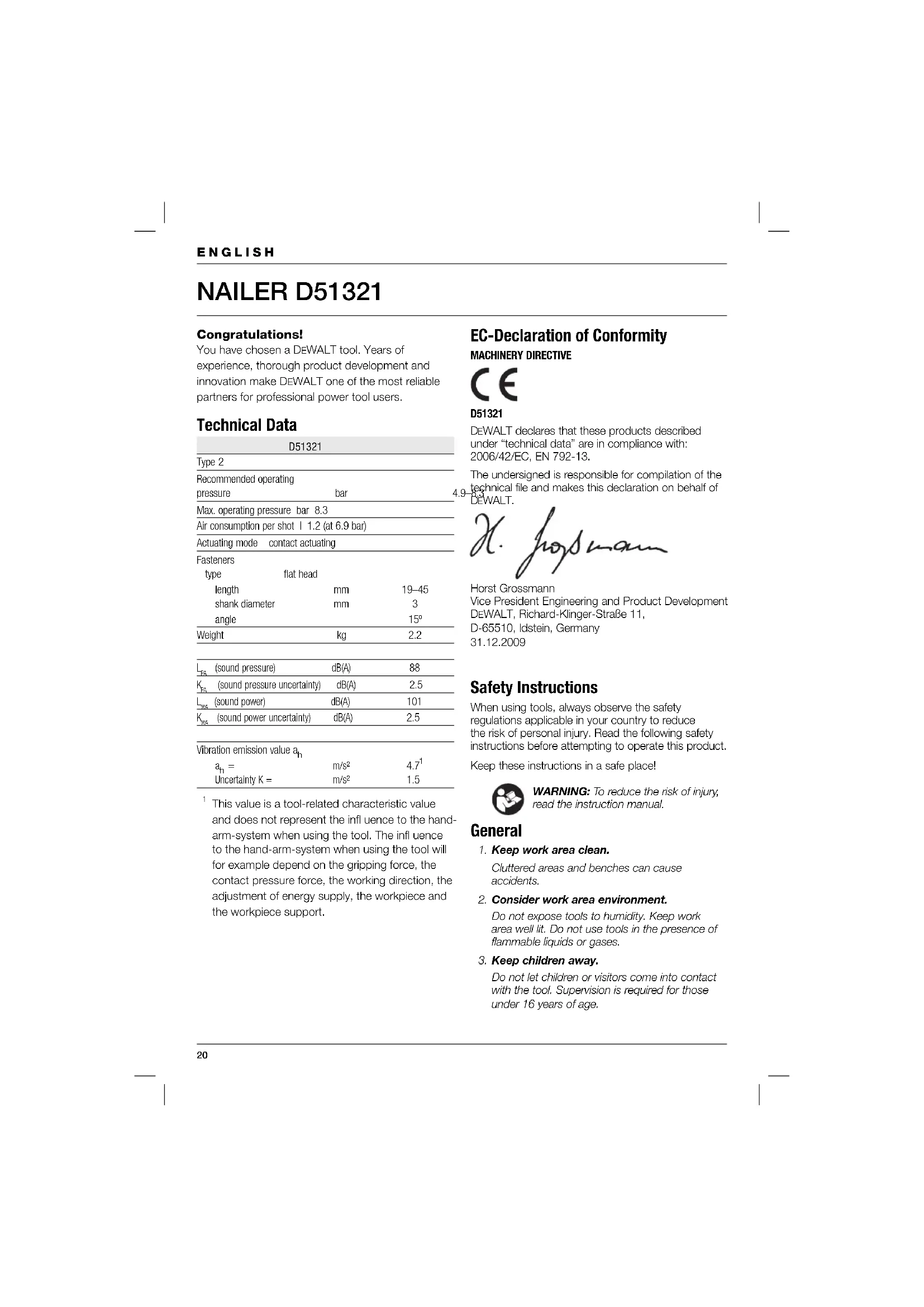 - Der Kaufbeleg wird vorgelegt;20 ENGLISH NAILER D51321 Congratulations! You have chosen a DEWALT tool. Years of experience, thorough product development and innovation make D EWALT one of the most reliable partners for professional power tool users. Technical Data D51321 Type 2 Recommended operating pressure bar 4.9–8.3 Max. operating pressure bar 8.3 Air consumption per shot l 1.2 (at 6.9 bar) Actuating mode contact actuating Fasteners type flat head length mm 19–45 shank diameter mm 3 angle 15º Weight kg 2.2