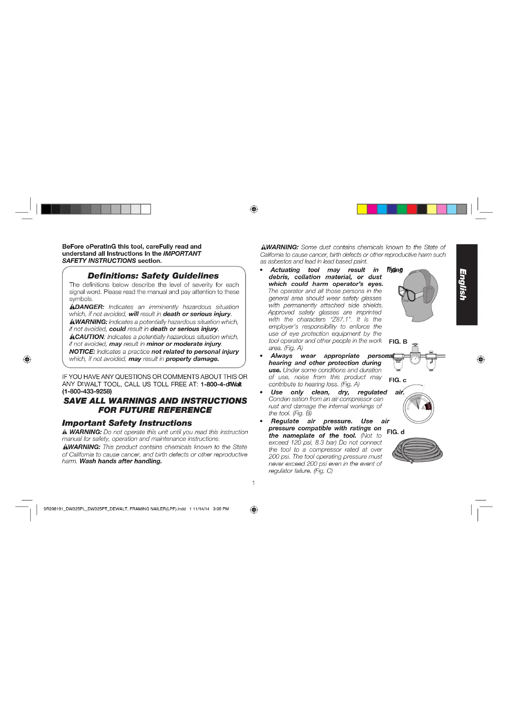9R208191_DW325PL_DW325PT_DEWALT, FRAMING NAILER(LPF).indd 1 11/14/14 3:06 PM• Only use air hose that is rated for a maximum working pressure of at least 150 PSI (10.3 BAR) or 150% of the maximumsystempressure,whicheverisgreater. (Fig. D)