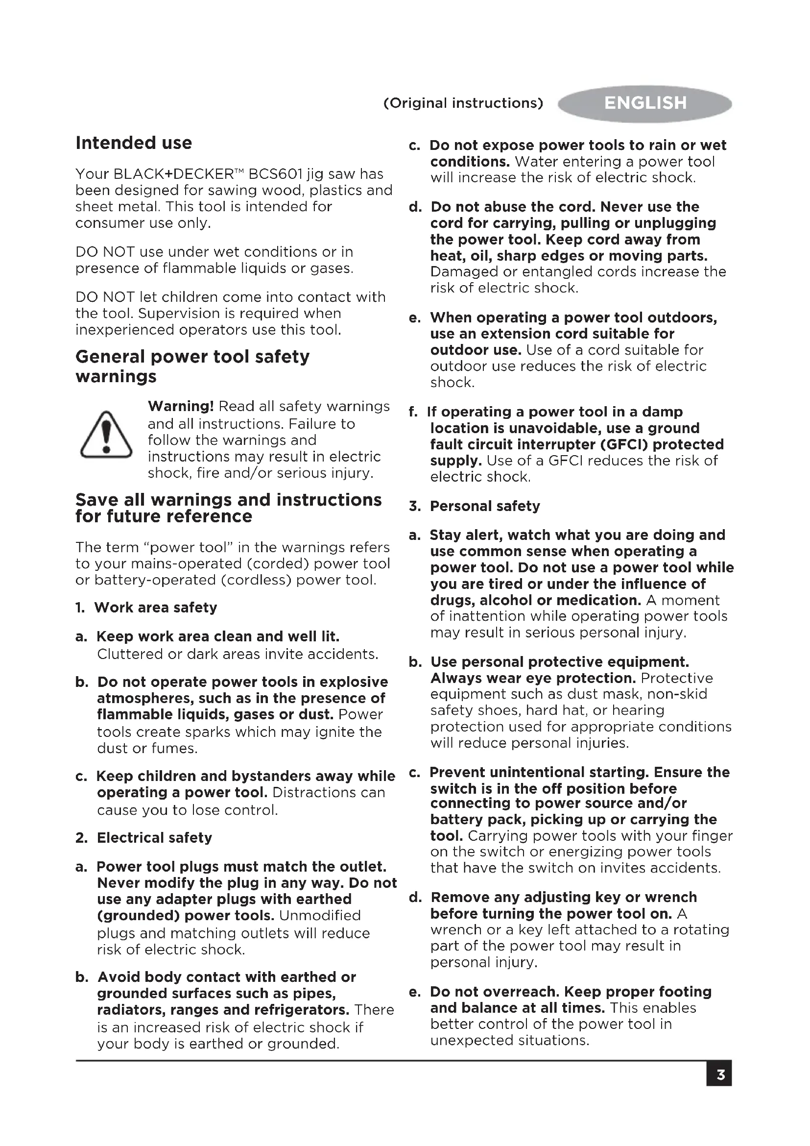 ENGLISH (Original instructions) Intended use Your BLACK+DECKER™ BCS601 jig saw has been designed for sawing wood, plastics and sheet metal. This tool is intended for consumer use only. DO NOT use under wet conditions or in presence of flammable liquids or gases. DO NOT let children come into contact with the tool. Supervision is required when inexperienced operators use this tool. General power tool safety warnings Warning! Read all safety warnings and all instructions. Failure to follow the warnings and instructions may result in electric shock, fire and/or serious injury. Save all warnings and instructions for future reference The term “power tool” in the warnings refers to your mains-operated (corded) power tool or battery-operated (cordless) power tool.