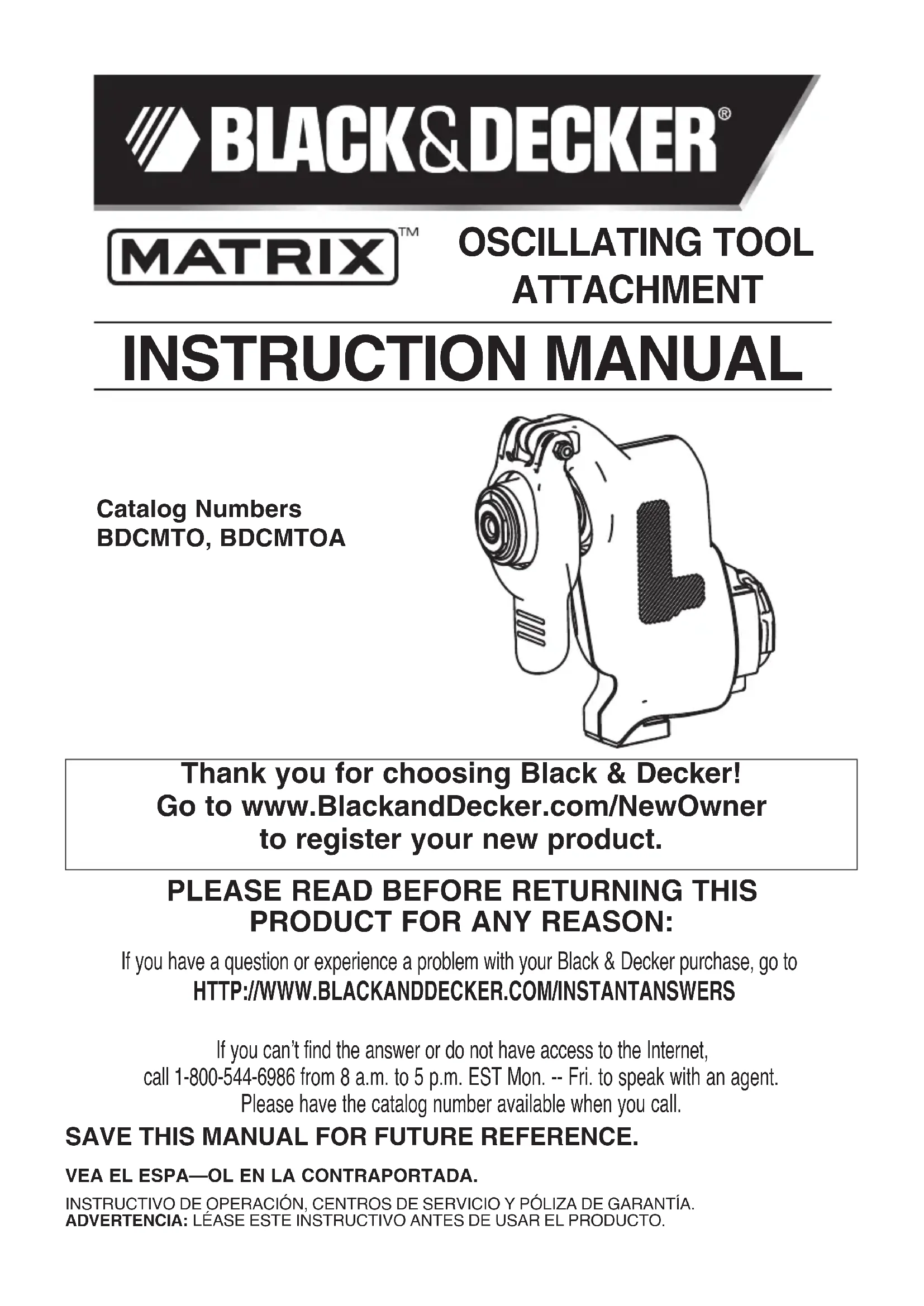 PRODUCT FOR ANY REASON: If you have a question or experience a problem with your Black & Decker purchase, go to HTTP://WWW.BLACKANDDECKER.COM/INSTANTANSWERS If you can’t find the answer or do not have access to the Internet, call 1-800-544-6986 from 8 a.m. to 5 p.m. EST Mon. -- Fri. to speak with an agent. Please have the catalog number available when you call.Catalog NumbersBDCMTO, BDCMTOASAVE THIS MANUAL FOR FUTURE REFERENCE. OSCILLATING TOOL ATTACHMENT2
