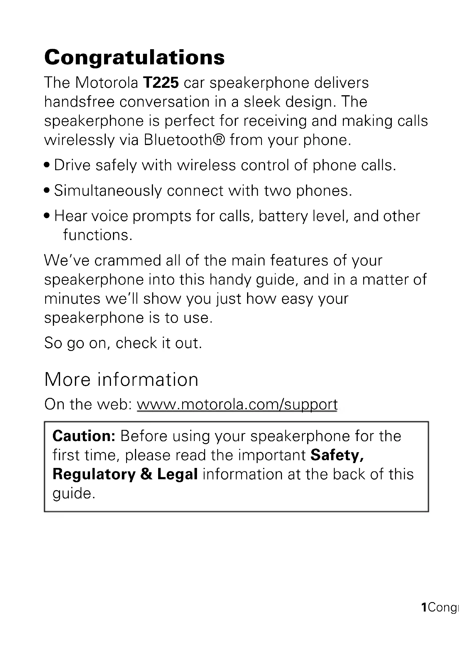 MOTOROLA T2251Congratulations Congratulations The Motorola T225 car speakerphone delivers handsfree conversation in a sleek design. The speakerphone is perfect for receiving and making calls wirelessly via Bluetooth® from your phone.
