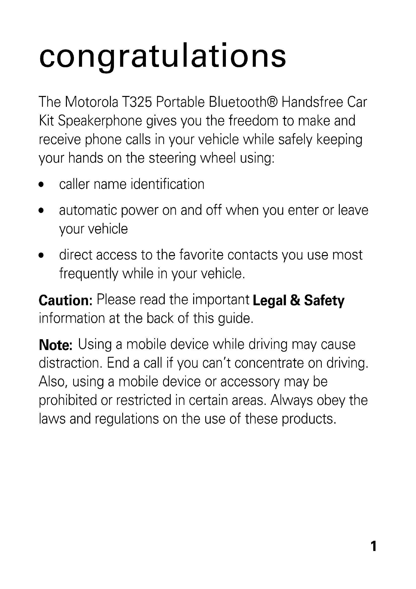 direct access to the favorite contacts you use most frequently while in your vehicle. Caution: Please read the important Legal & Safety information at the back of this guide. Note: Using a mobile device while driving may cause distraction. End a call if you can’t concentrate on driving. Also, using a mobile device or accessory may be prohibited or restricted in certain areas. Always obey the laws and regulations on the use of these products.your speakerphone