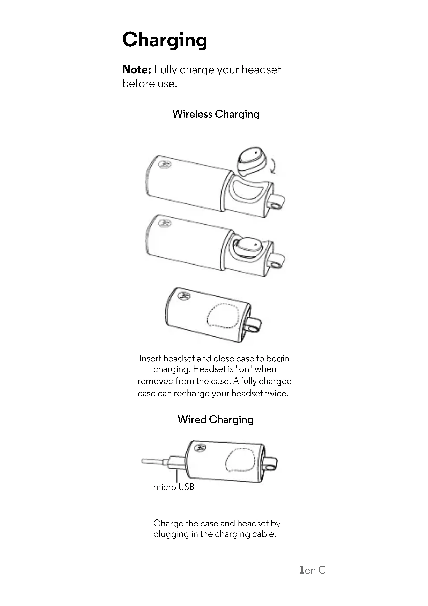 Charge case light indicator In-ear Off. Removed from case Turns on briefly to show power to headset. Wired charging of case and headset Headset in case Headset and case are charging. Case Case charging. Light Charge status Blinks white Charging. Solid white Fully charged.7en Lighting Notes:
