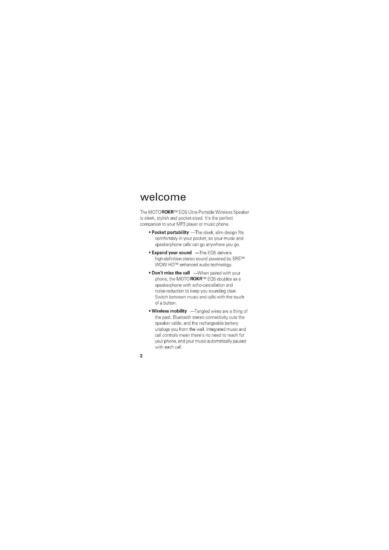 Quick Start Guide EQ5 MOTOROKR TM2 welcome The MOTO ROKR ™ EQ5 Ultra-Portable Wireless Speaker is sleek, stylish and pocket-sized. It’s the perfect companion to your MP3 player or music phone.