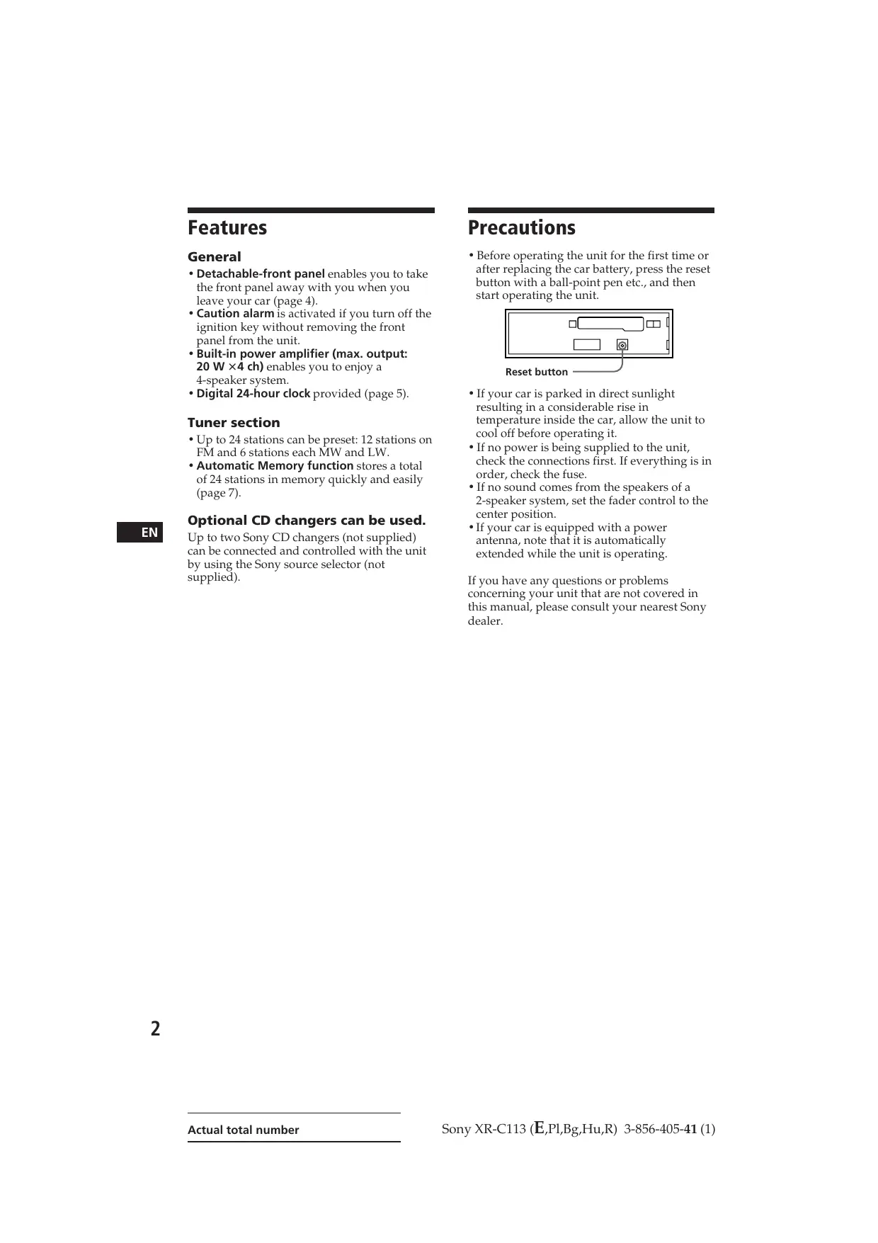 - Before removing the front panel, be sure to turn the power off. However, if you press the RELEASE button to detach the panel while the unit is still turned on, the power is automatically turned off in order to protect the speakers from being damaged. Actual total number Sony XR-C113 (E,Pl,Bg,Hu,R) 3-856-405-41 (1) Setting the Clock The clock has a 24-hour digital indication. Cassette Player Operation For example, setting it to 10:08