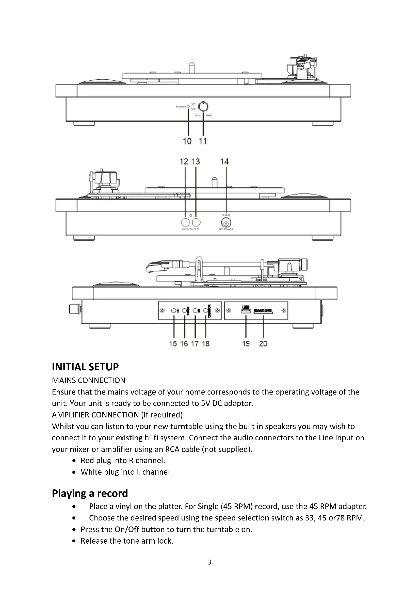 2INITIAL SETUP MAINS CONNECTION Ensure that the mains voltage of your home corresponds to the operating voltage of the unit. Your unit is ready to be connected to 5V DC adaptor. AMPLIFIER CONNECTION (if required) Whilst you can listen to your new turntable using the built in speakers you may wish to connect it to your existing hi-fi system. Connect the audio connectors to the Line input on your mixer or amplifier using an RCA cable (not supplied).