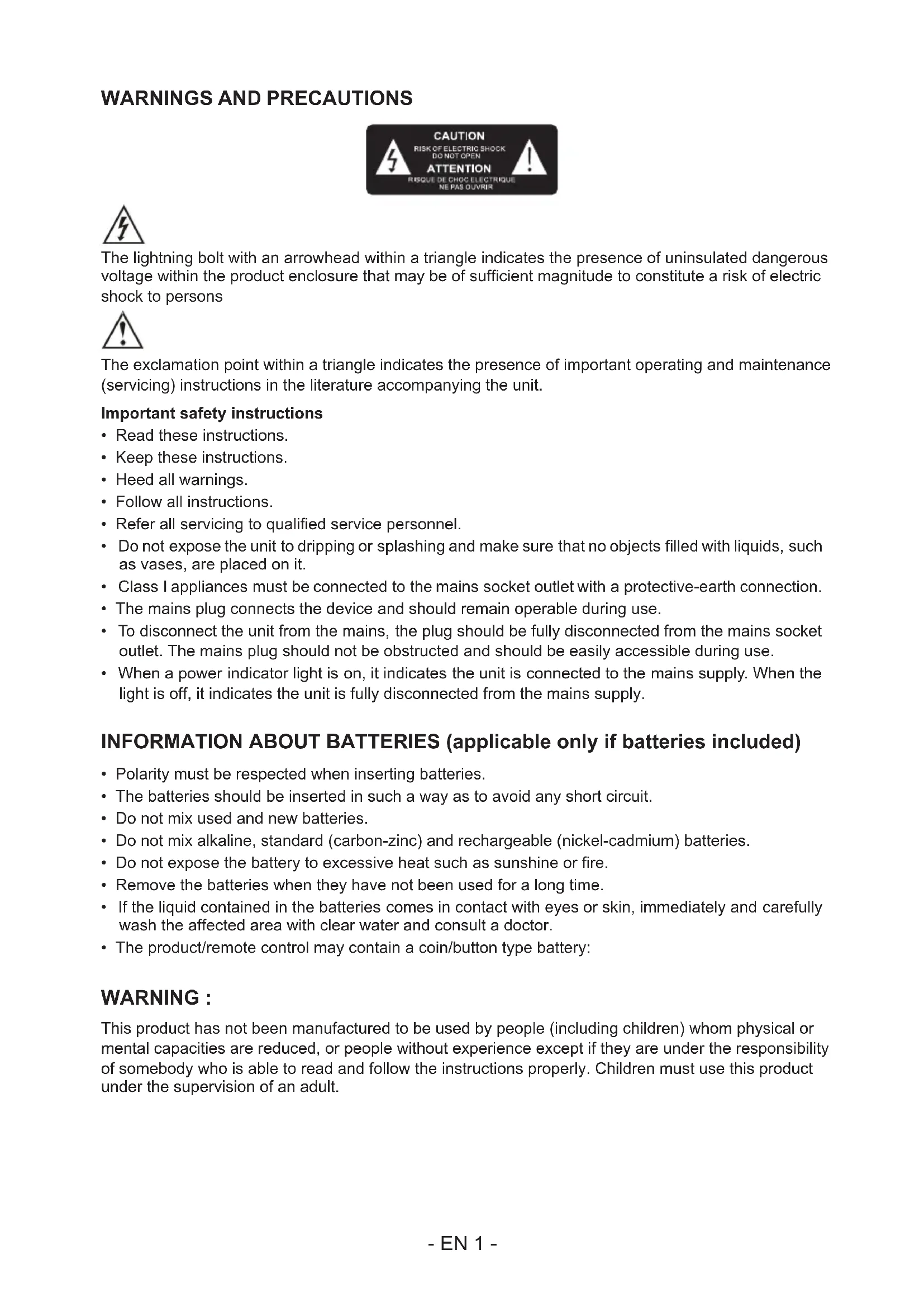 This product has not been manufactured to be used by people (including children) whom physical or mental capacities are reduced, or people without experience except if they are under the responsibility of somebody who is able to read and follow the instructions properly. Children must use this product under the supervision of an adult.- EN 2 - WARNING CONCERNING BATTERIES : Don’t swallow batteries. Risk of chemical burning. This product contains one or several batteries. If a battery is swallowed, it can cause within less than 2 hours severe internal damages and death. Keep new and old batteries away from children and vulnerable people. If the compartment of batteries can’t be closed correctly, please don’t use the product any longer. If a battery is swallowed, please go and see a doctor immediately. IMPORTANT REMARKS : Risk of explosion if the battery/ies is/are not replaced correctly or if the product is not used for a long time with batteries left inside. Replace old batteries by an identical or similar models. double insulation direct current alternating current Symbol indoor use Care of the environment Your product is designed and manufactured with high quality materials and components, which can be recycled and reused. Your product contains batteries covered by the European Directive 2006/66/EC, which cannot be disposed with normal household waste. Please inform yourself about the local rules on separate collection of batteries because correct disposal helps to prevent negative consequences for the environmental and human health. When this crossed-out wheeled bin symbol is attached to a product it means that the product is covered by the European Directive 2002/96/EC. Please inform yourself about the local separate collection system for electrical and electronic products. Please act according to your local rules and do not dispose of your old products with your normal household waste. Correct disposal of your old product helps to prevent potential negative consequences for the environment and human health. Compliance This product complies with the radio interference requirements of the Europe Community. This apparatus includes this label- EN 3 - Battery power: Be sure that the batteries are inserted correctly to avoid damage to the appliance. Always remove the batteries when appliance will not be used for a long period of time, as this will cause leakage to the batteries and subsequently damage to your set. Use batteries of the same type. Never use different types of batteries together. Do not throw the battery into the re, or exposed to sunshine or the like. If the liquid contained in the batteries comes in contact with eyes or skin, wash the area immediately and carefully with clear water and consult a doctor CAUTION