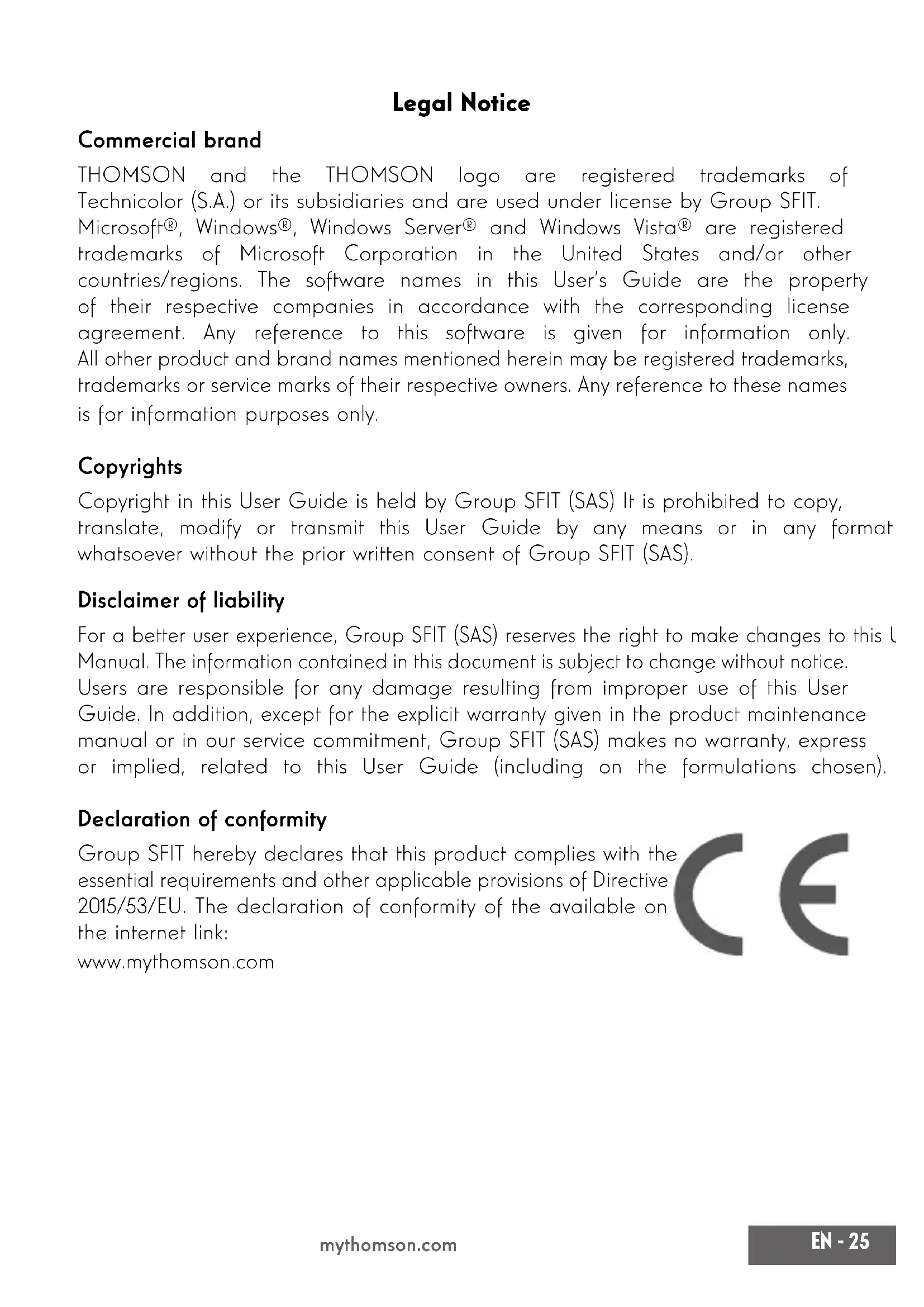mythomson.com Legal Notice Commercial brand THOMSON and the THOMSON logo are registered trademarks of Technicolor (S.A.) or its subsidiaries and are used under license by Group SFIT. Microsoft®, Windows®, Windows Server® and Windows Vista® are registered trademarks of Microsoft Corporation in the United States and/or other countries/regions. The software names in this User’s Guide are the property of their respective companies in accordance with the corresponding license agreement. Any reference to this software is given for information only. All other product and brand names mentioned herein may be registered trademarks, trademarks or service marks of their respective owners. Any reference to these names is for information purposes only. Copyrights Copyright in this User Guide is held by Group SFIT (SAS) It is prohibited to copy, translate, modify or transmit this User Guide by any means or in any format whatsoever without the prior written consent of Group SFIT (SAS). Disclaimer of liability For a better user experience, Group SFIT (SAS) reserves the right to make changes to this User Manual. The information contained in this document is subject to change without notice. Users are responsible for any damage resulting from improper use of this User Guide. In addition, except for the explicit warranty given in the product maintenance manual or in our service commitment, Group SFIT (SAS) makes no warranty, express or implied, related to this User Guide (including on the formulations chosen). Declaration of conformity Group SFIT hereby declares that this product complies with the essential requirements and other applicable provisions of Directive 2015/53/EU. The declaration of conformity of the available on the internet link: www.mythomson.com26 - EN User’s Manual - AIO - 23.8’’ mythomson.com - Important safety instructions - This unit should be used in an environment with an ambient temperature between 5°C (41°F) and 35°C (95°F). Do not expose the unit to rain or moisture and keep it away from liquids. In case of splashing water or other liquid on the unit, immediately switch off the unit and wait until it is completely dry before turning it on again. Do not expose the device directly to solar radiation Do not use strong solvents, liquid detergents or other chemicals on or near the surface of the unit to prevent corrosion or deterioration of the surface of the unit. Do not expose the camera to a dusty environment. Do not use the unit during a gas leak. Do not expose the device to strong magnetic or electric elds. You can run the device through airport x-ray detectors. However, it is recommended not to pass your device through the magnetic detection portals or expose it to portable detectors. Do not place any objects on the device. Do not place the unit on an uneven or unstable surface. Make sure to protect the unit from falls or any other impact that may damage it. Do not leave the appliance on or loaded on your lap or any other part of your body to avoid any risk of heat-related injuries. Switch off the unit before transporting it or covering it with a material that does not allow optimal air circulation. Do not use damaged power cords, accessories or other devices with your device. We recommend the exclusive use of the accessories (power supply, cables, etc.) supplied with the unit. Use only original batteries. Replacing the battery with an incorrect battery can cause an explosion risk.EN - 27 mythomson.com Do not disassemble, modify or repair the unit yourself, as this may void the warranty. Please back up your important content regularly to avoid data loss. Our company accepts no responsibility for the loss or removal of items contained in the device due to improper use of the hardware or software, lack of maintenance or any other accidental event. At full volume, prolonged listening to the portable audio device may damage the user’s hearing. This product has been designed to allow proper recycling of parts and components. The symbol representing a crossed-out wheeled bin indicates that the device should not be disposed of with municipal waste. Consult local regulations for disposal of electronic devices. The symbol representing a crossed-out wheeled bin indicates that the battery should not be disposed of with municipal waste. Consult local regulations for battery disposal.28 - EN User’s Manual - AIO - 23.8’’ mythomson.com - Presentation of the device - Front view Note : The presentation of the device and some features may vary by country, model or version. Rear view Bottom view