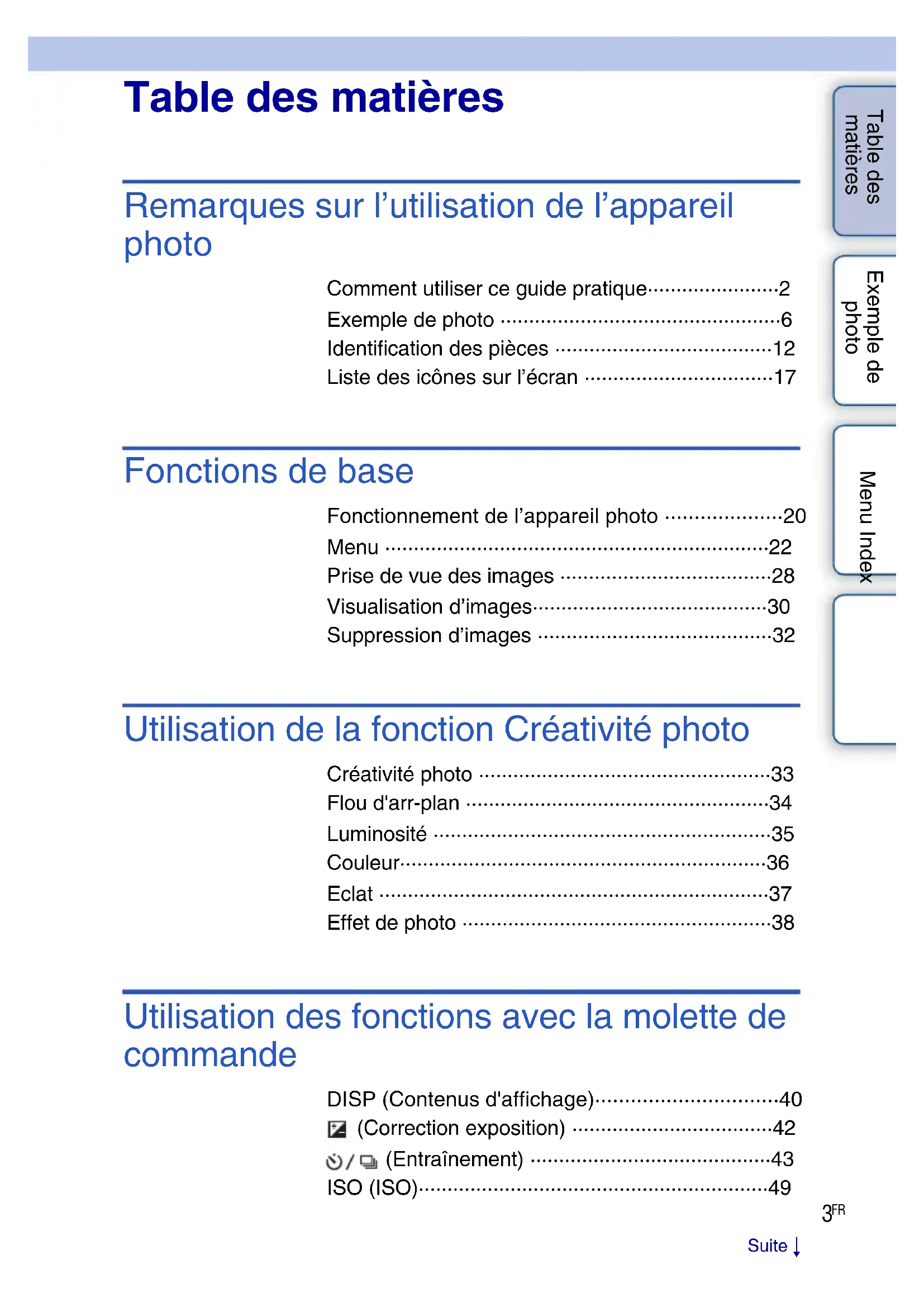 Table des matières Exemple de photo Menu Index Table des matières Remarques sur l’utilisation de l’appareil photo Comment utiliser ce guide pratique·······················2 Exemple de photo ·················································6 Identification des pièces ······································12 Liste des icônes sur l’écran ·································17 Fonctions de base Fonctionnement de l’appareil photo ····················20 Menu ···································································22 Prise de vue des images ·····································28 Visualisation d’images·········································30 Suppression d’images ·········································32 Utilisation de la fonction Créativité photo Créativité photo ···················································33 Flou d'arr-plan ·····················································34 Luminosité ···························································35 Couleur································································36 Eclat ····································································37 Effet de photo ······················································38 Utilisation des fonctions avec la molette de commande DISP (Contenus d'affichage)·······························40 (Correction exposition) ···································42 (Entraînement) ··········································43 ISO (ISO)·····························································49 Suite r4